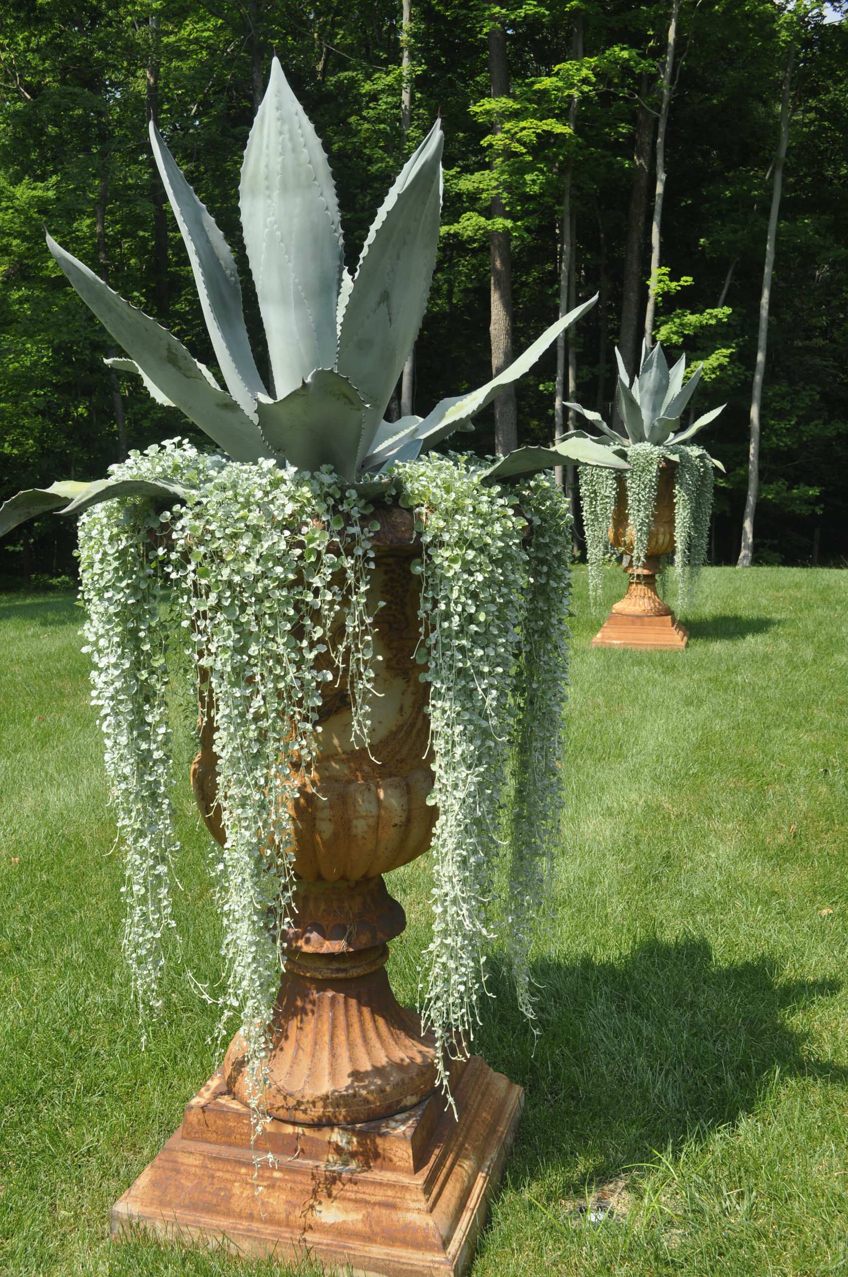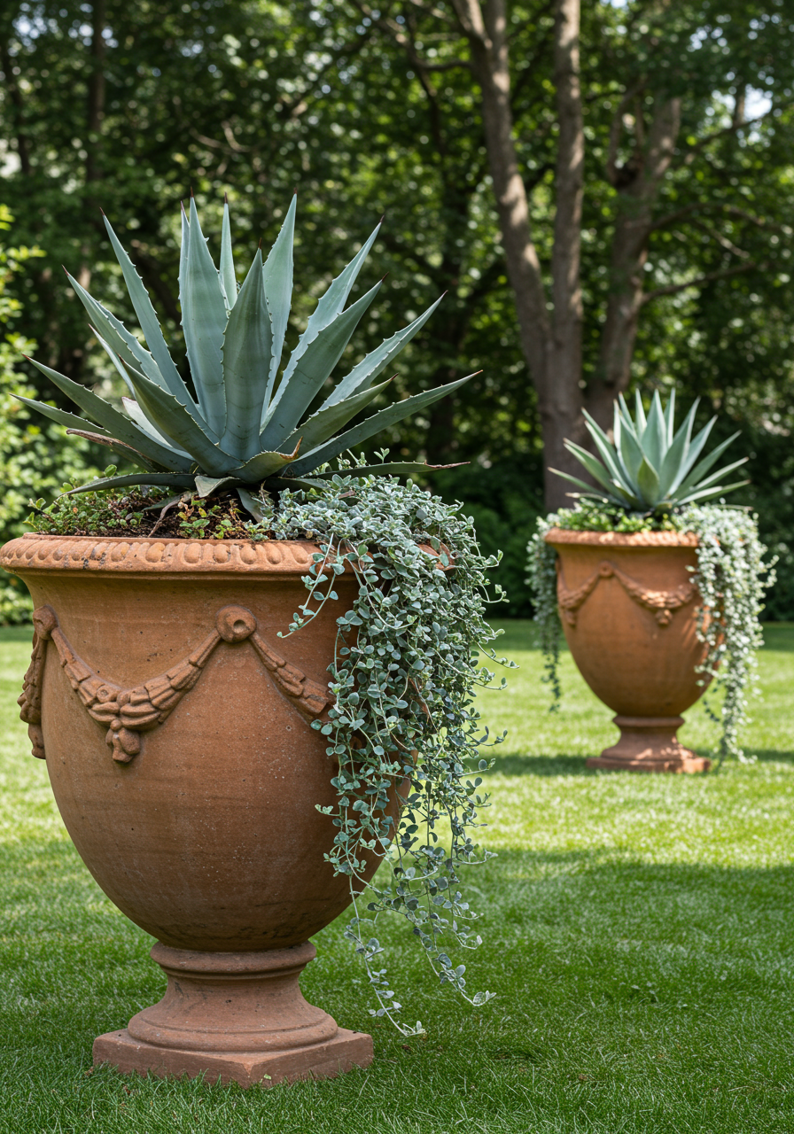 Bring drama to your patio or frame the entrance to a driveway with an eye-catching combination of bold agaves and trailing ‘Silver Falls’ dichondra (Dichondra argentea ‘Silver Falls’). In this arrangement by McCullough’s Landscape & Nursery, they’re planted in traditional urns, which would look right at home outside a grand Mediterranean villa. The same monochromatic plant combination in simple, contemporary containers could look chic and modern. Both plants thrive with little water and care.
