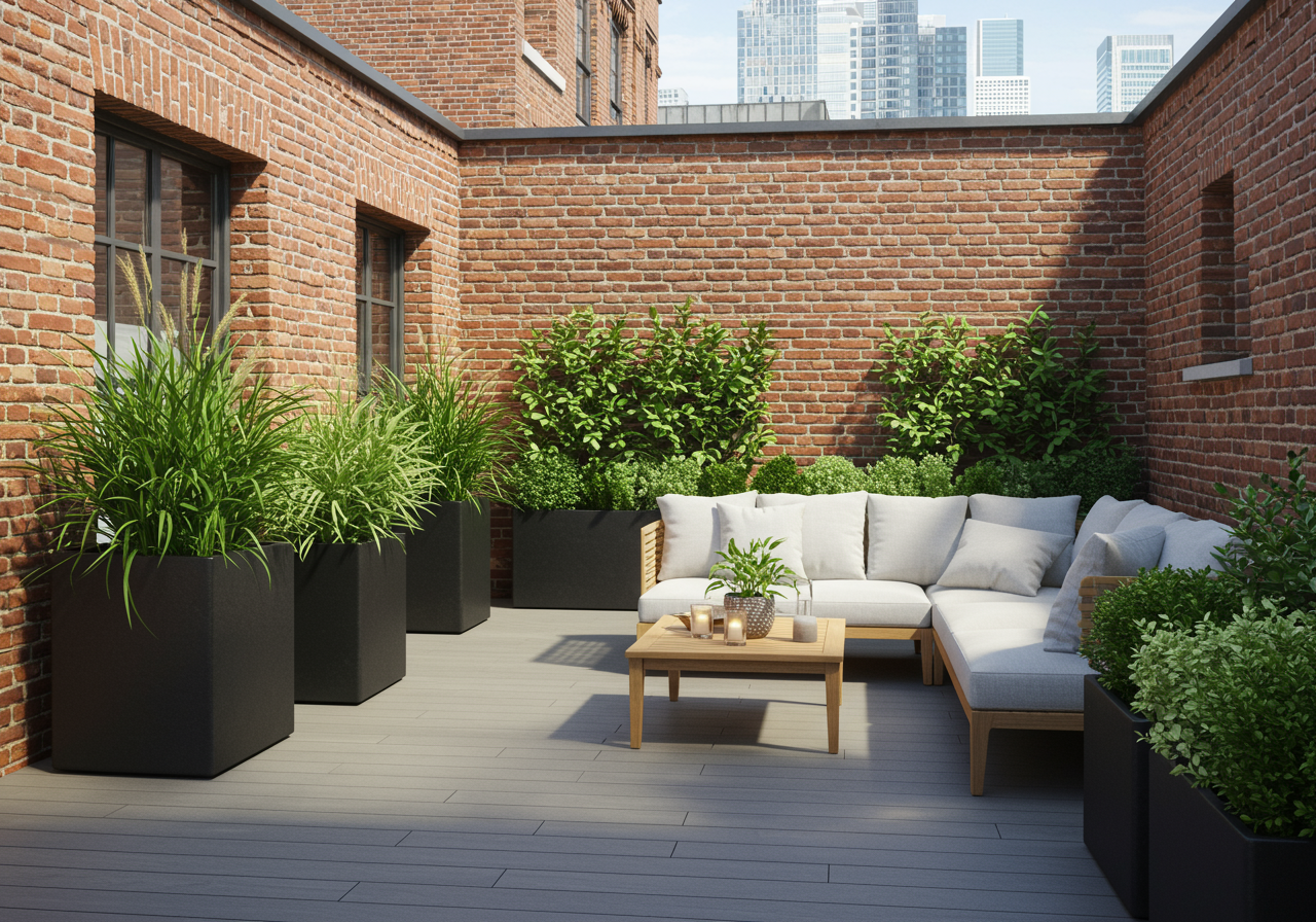 Dozens of potted plants dot this roof terrace designed by New Eco Landscapes in Manhattan, but this combination of wispy dwarf maiden grass (Miscanthus sinensis‘Adagio’) and two colors of sweet potato vine (Ipomoea batatas) stands out for its beauty and simplicity. Planting in tall containers boosts the height of the grasses, turning them into a shimmering canopy, and gives plenty of room for the sweet potato vines to tumble down the sides with lush foliage.