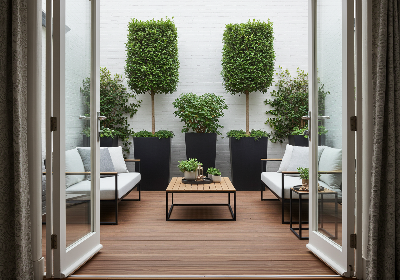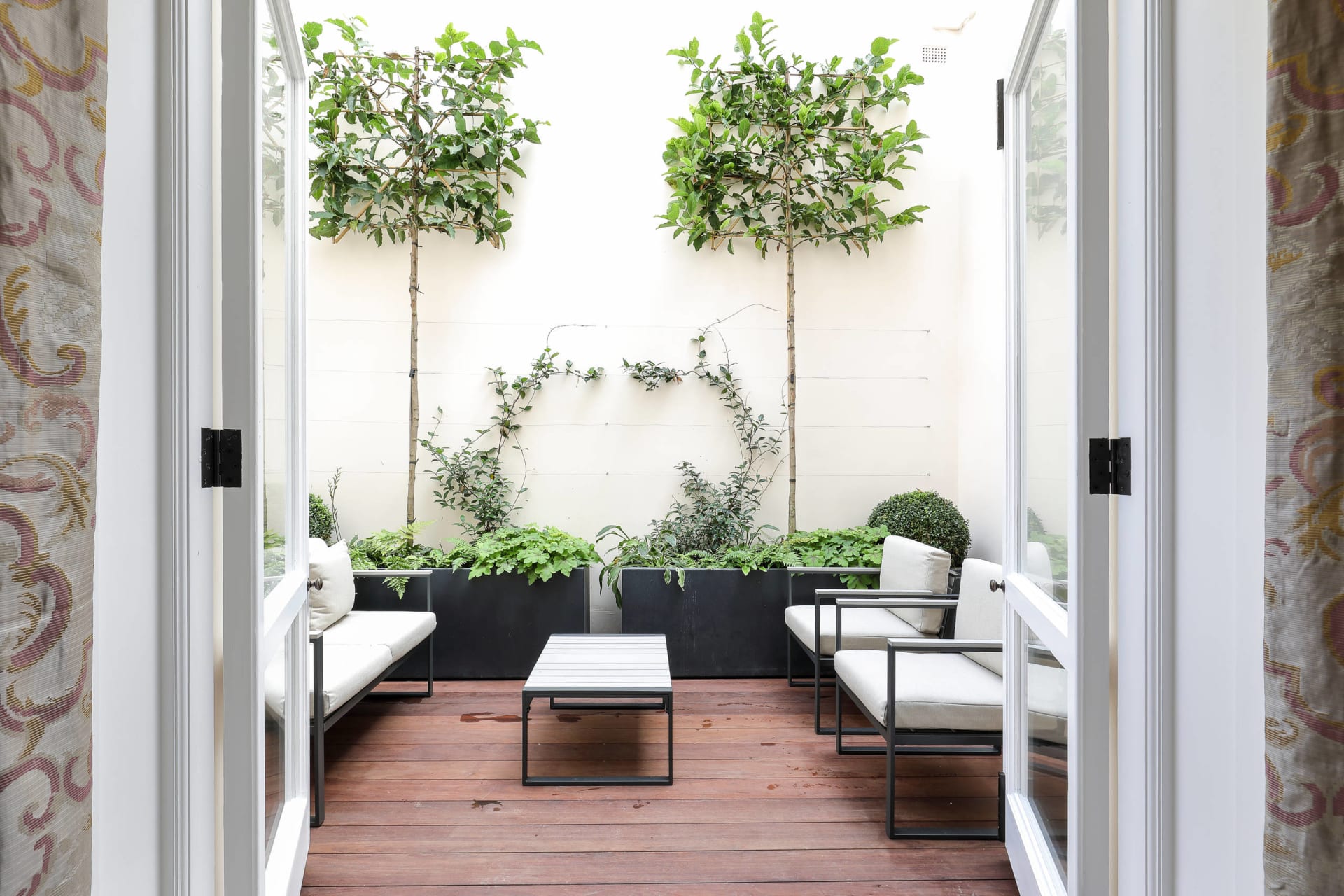 A combination of espaliered trees, climbing jasmine, clipped boxwood (Buxus sp.) and low woodland-style plantings of ferns and coral bells (Heuchera sp.) adds a welcome dose of green to a courtyard outside a London townhouse.