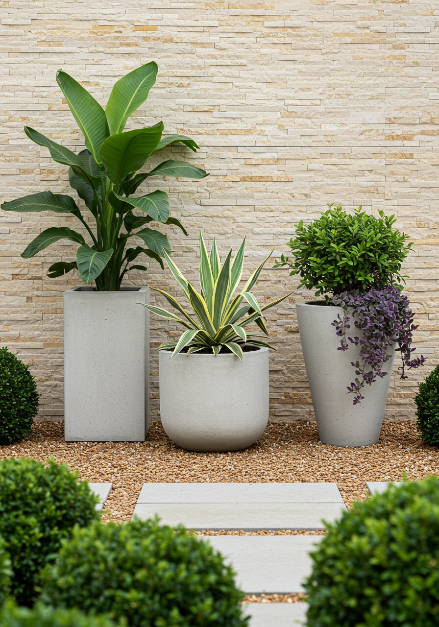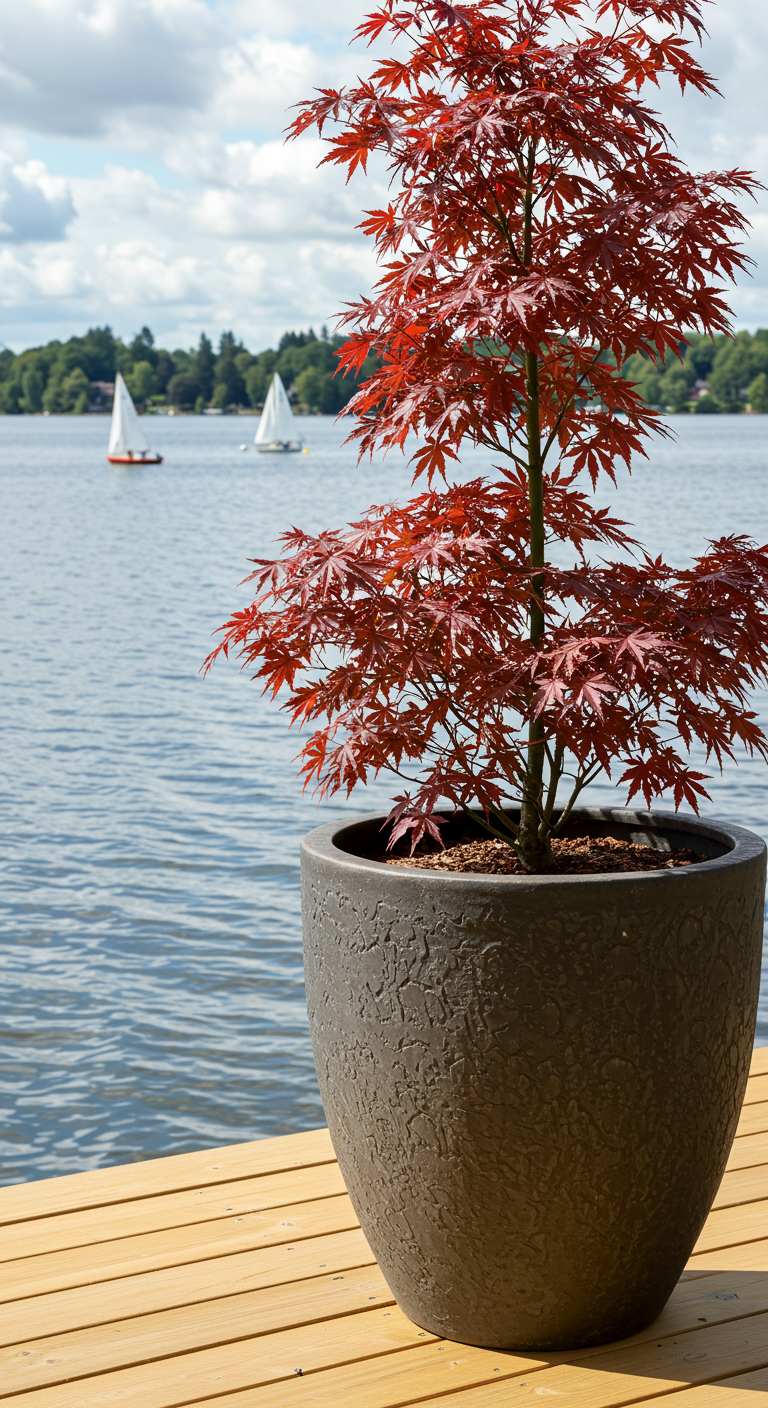 Keep it simple with a specimen tree planted in an elegant pot that’s big enough for the tree to grow there for years. (Make sure your pot has drainage holes.) In this container by Bliss Garden Design, a bronze-foliage Japanese maple (Acer palmatum) under-planted with maidenhair vine (Muehlenbeckia complexa) thrives in a waterside garden in the Pacific Northwest.