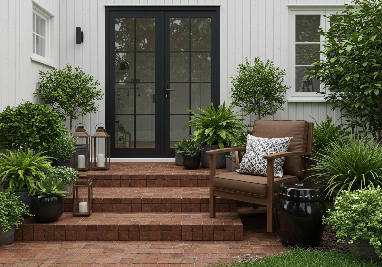 Layered foliage pots and an inviting outdoor chair transform this backyard patio in Sausalito, California, into a lush, tropical-feeling retreat. A trio of New Zealand flax (Phormium spp.) potted at different heights add upper and mid-level interest to the design. Smaller pots feature rosettes of cactus and succulents, including silver-blue Parry’s agave (Agave parryi) and golden barrel cactus (Echinocactus grusonii), alongside delicate maidenhair ferns (Adiantum sp.) and Japanese painted ferns (Athyrium niponicum var. pictum).