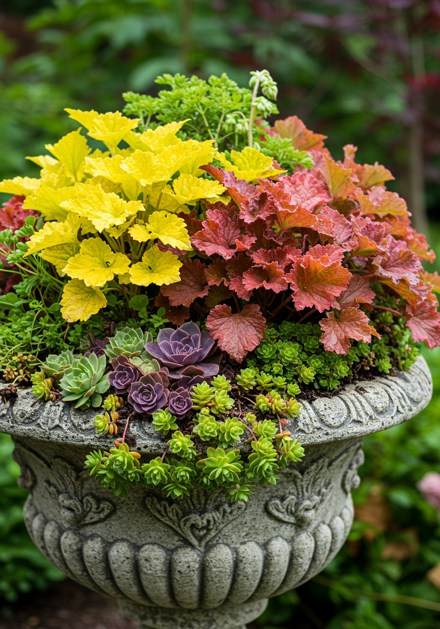 Lime- and pink-colored coral bells (Heuchera spp.) and a crush of hens-and-chicks (Sempervivum sp.) succulents make for a playful combination in this concrete urn arranged by Cording Landscape Design in New York.