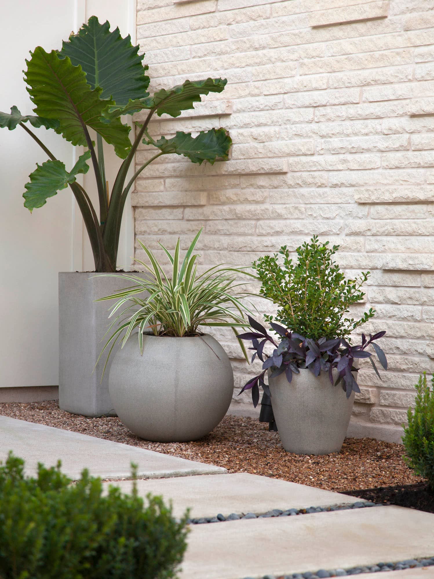 The dramatic oversize leaves of elephant’s ear (Alocasia sp.) are the clear stars of this container vignette by B. Jane Gardens beside the front entry of a home in Austin, Texas. The designer used other plants as supporting acts to add foliage variation, including boxwood (Buxus sp.), purple heart (Tradescantiapallida‘Purpurea’) and variegated flax lily (Dianella tasmanica‘Variegata’).