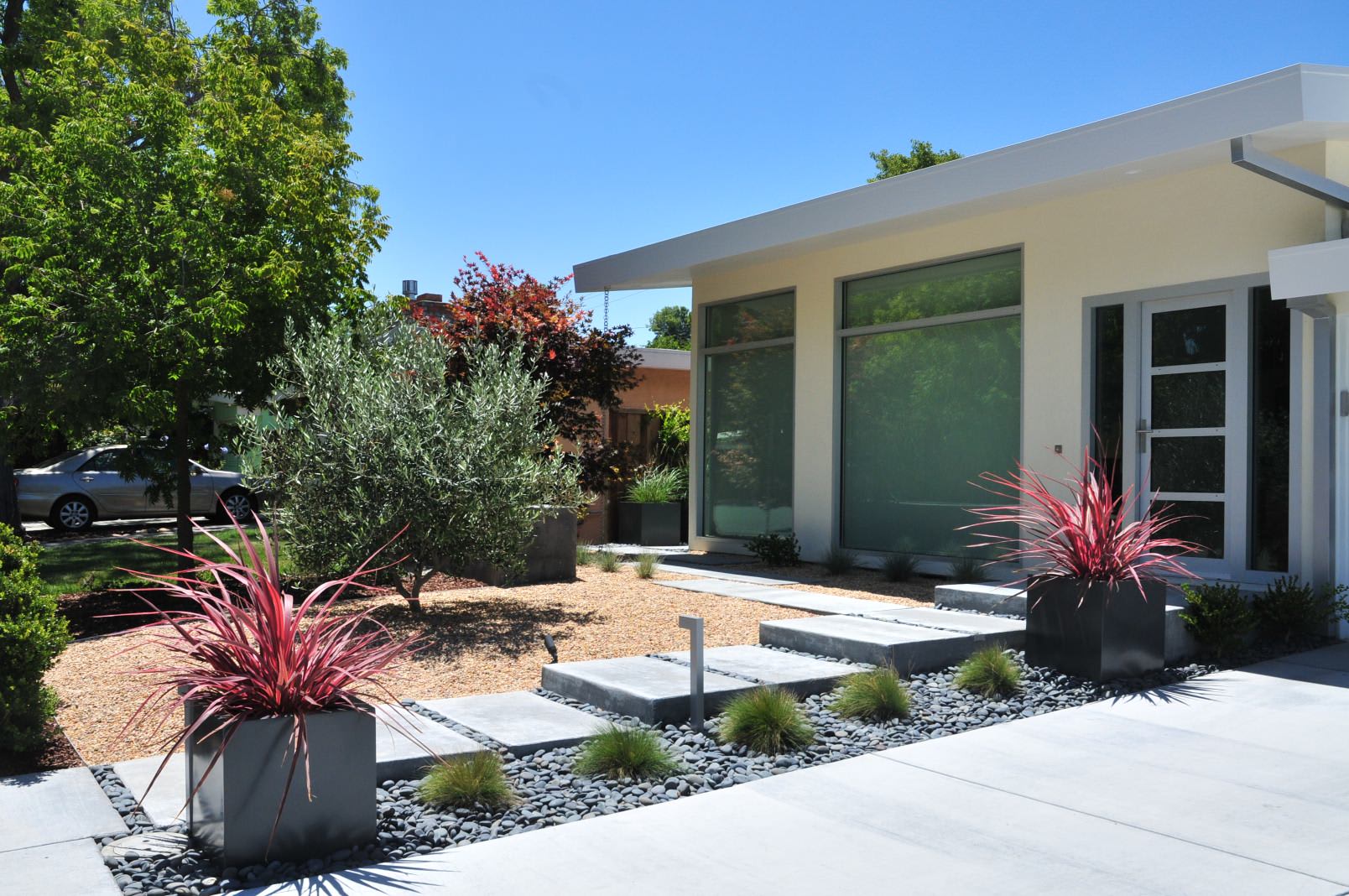 The strappy leaves of brightly colored New Zealand flax (Phormium sp.) stand out like a celebratory display of fireworks in this low-water garden by Skyline design studio in the San Francisco Bay Area. The evergreen plants need little water or care and add color to gardens year-round. Many New Zealand flax run on the large size (although they usually grow more slowly in containers). For smaller dwarf varieties, consider coral-colored ‘Jester’, bronze ‘Jack Spratt’ or reddish bronze Sweet Mist.