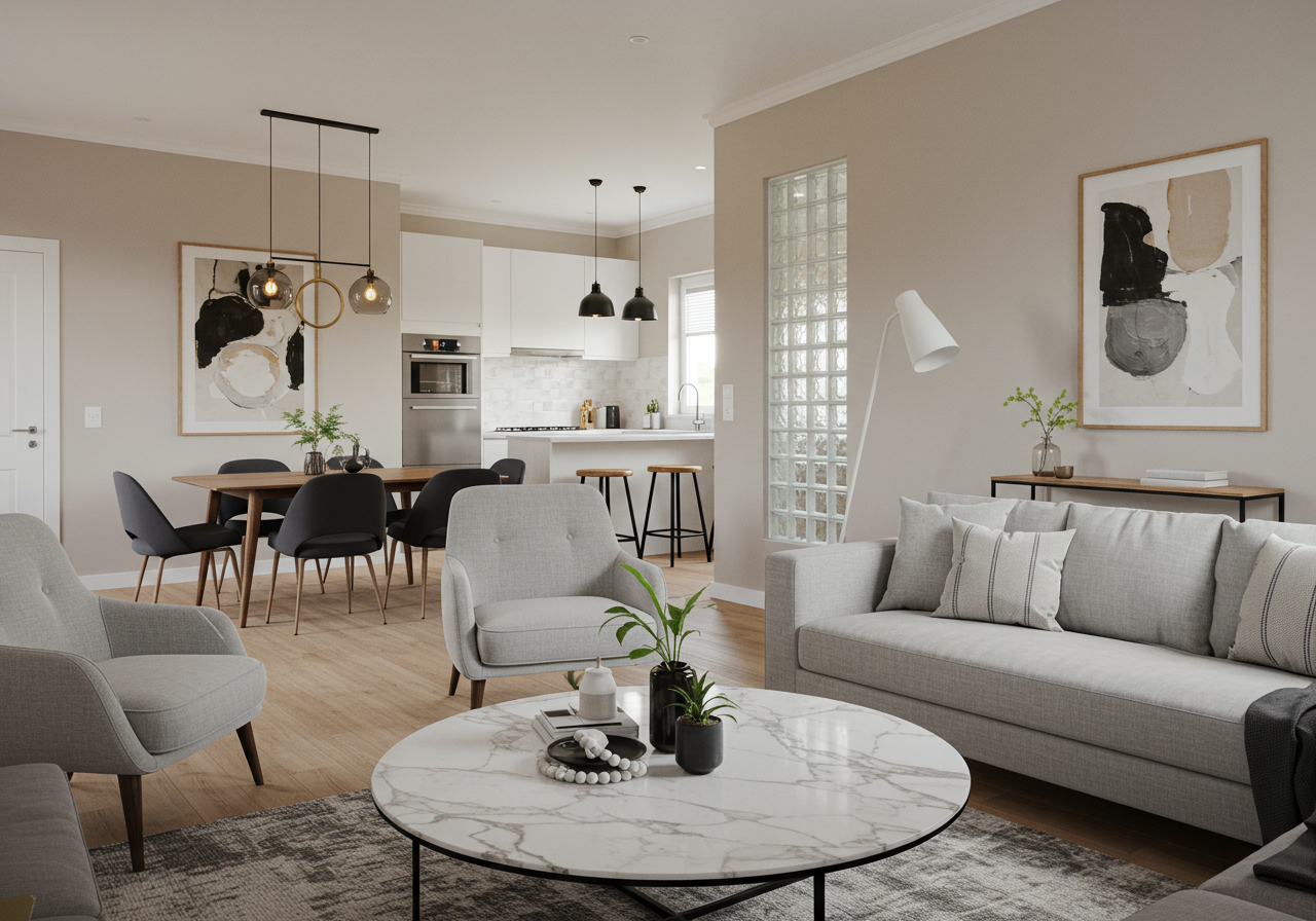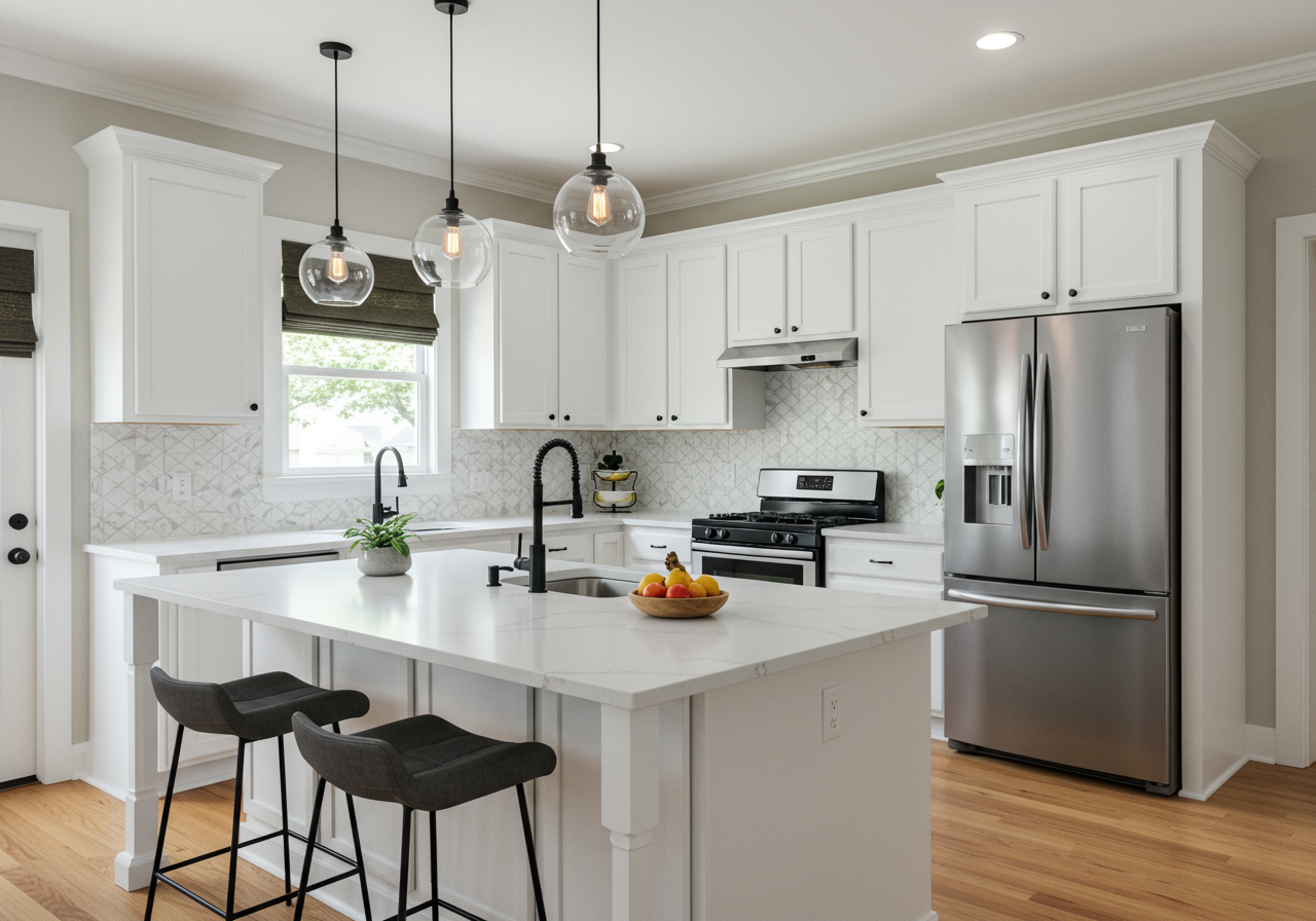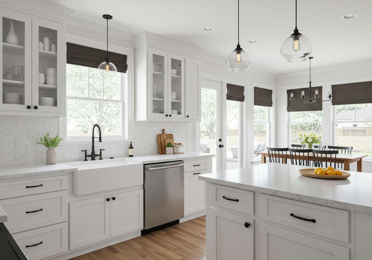 The kitchen is beautifully updated with white cabinets, black stainless steel appliances, quartz countertops, and pantry storage. The large island is perfect for meal prep or casual dining with friends and family.