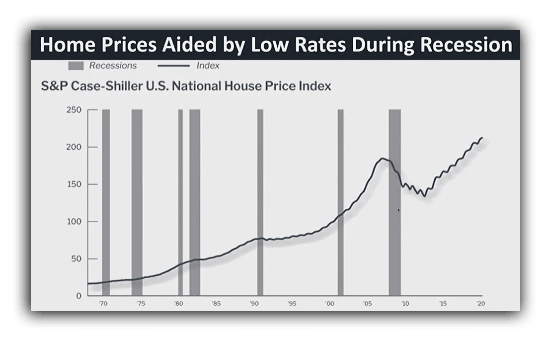 The gray lines in the graph are economic recessions in the United States. There’s a slight blip in 2001 and a BIG one for the Great Recession in 2008 (which was caused by real estate and bad lending practices). However, recessions almost always INCREASE home prices because interest rates are lowered to stimulate the economy.