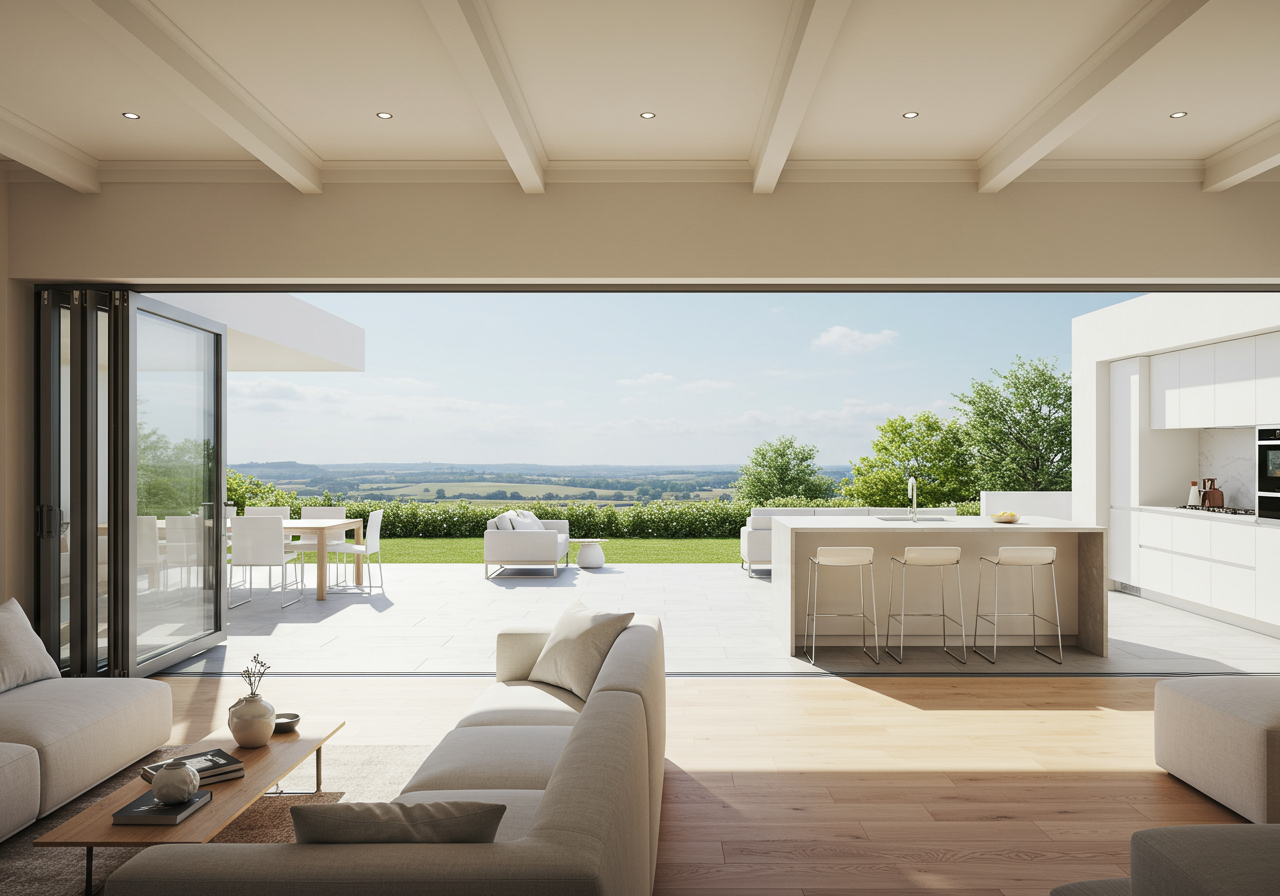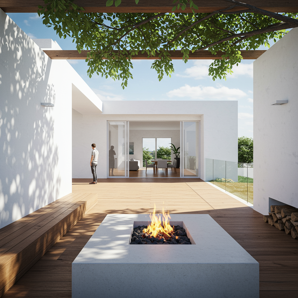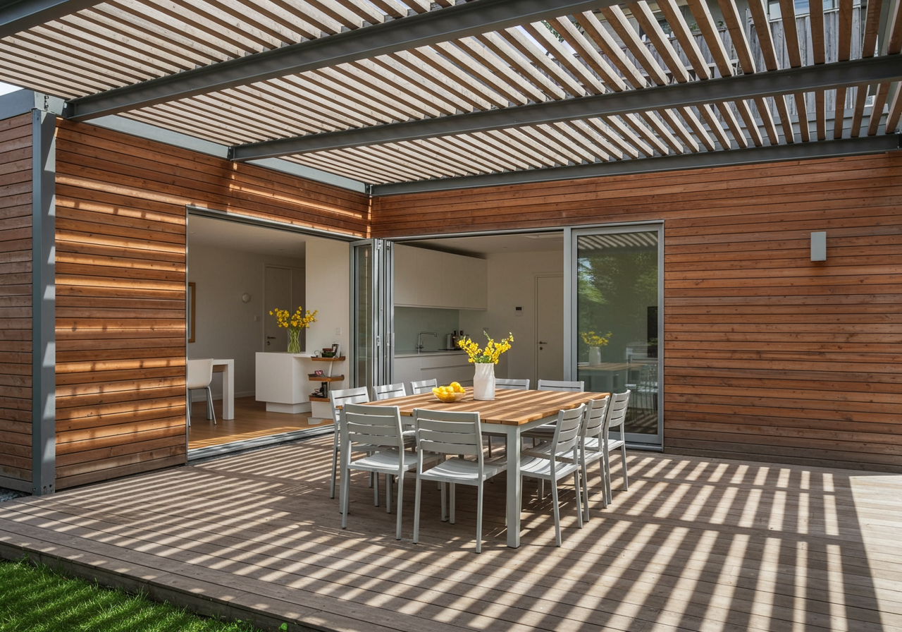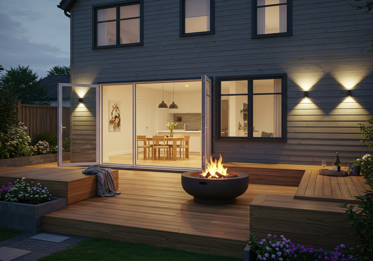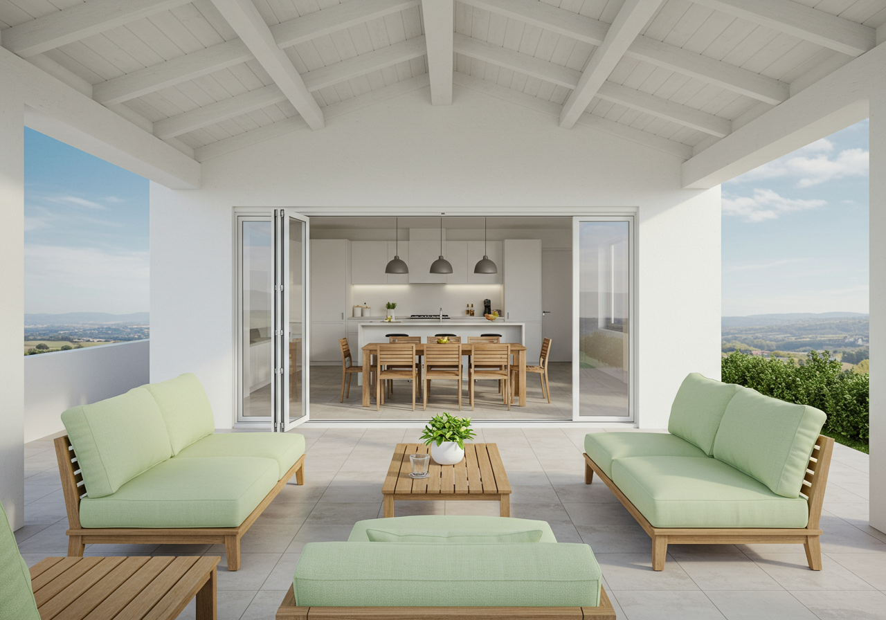 Let the same surfaces slide from indoors to out for a cohesive, functional design. Consider durable materials such as ultracompact surfaces that look sleek and weather well. Installing a grill or a sink on the outside countertops enhances cooking capabilities and pairs with indoor appliances.