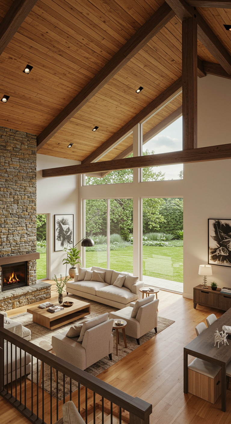 SOUND CONTROL. Noting that large expanses of glass and a massive stone fireplace can make a space feel edgy and sharp, Teague called on his considerable knowledge of acoustics—he designed Aspen’s Benedict Music Tent and Harris Concert Hall—to damp down the noise levels. “We tempered the glass and stone with sound-absorbing insulation in the ceiling, covered with wood slats,” he explains. “Psychologically, the use of wood has the effect of turning a cool space into a warm one.”