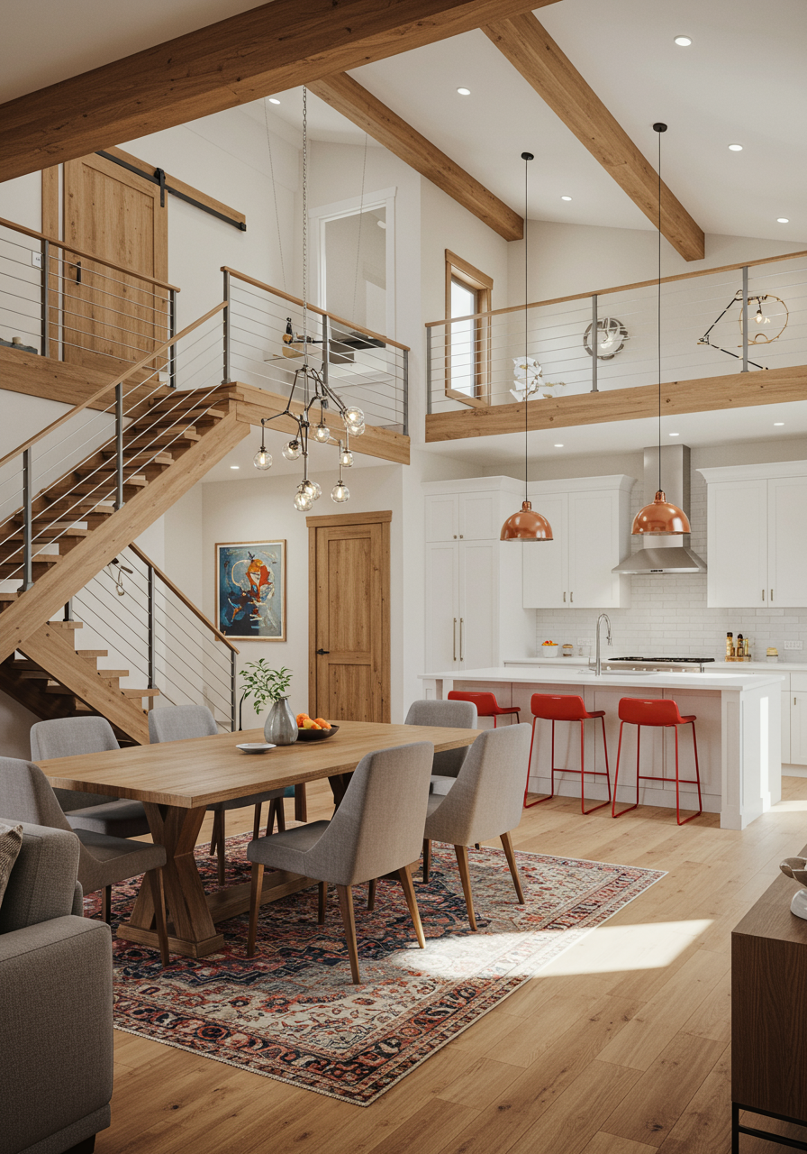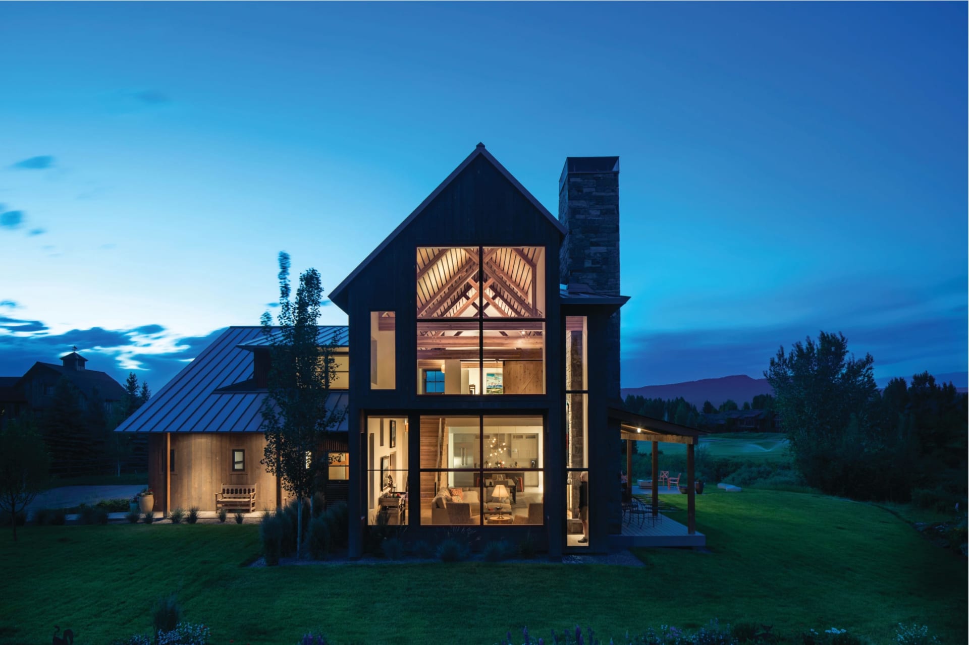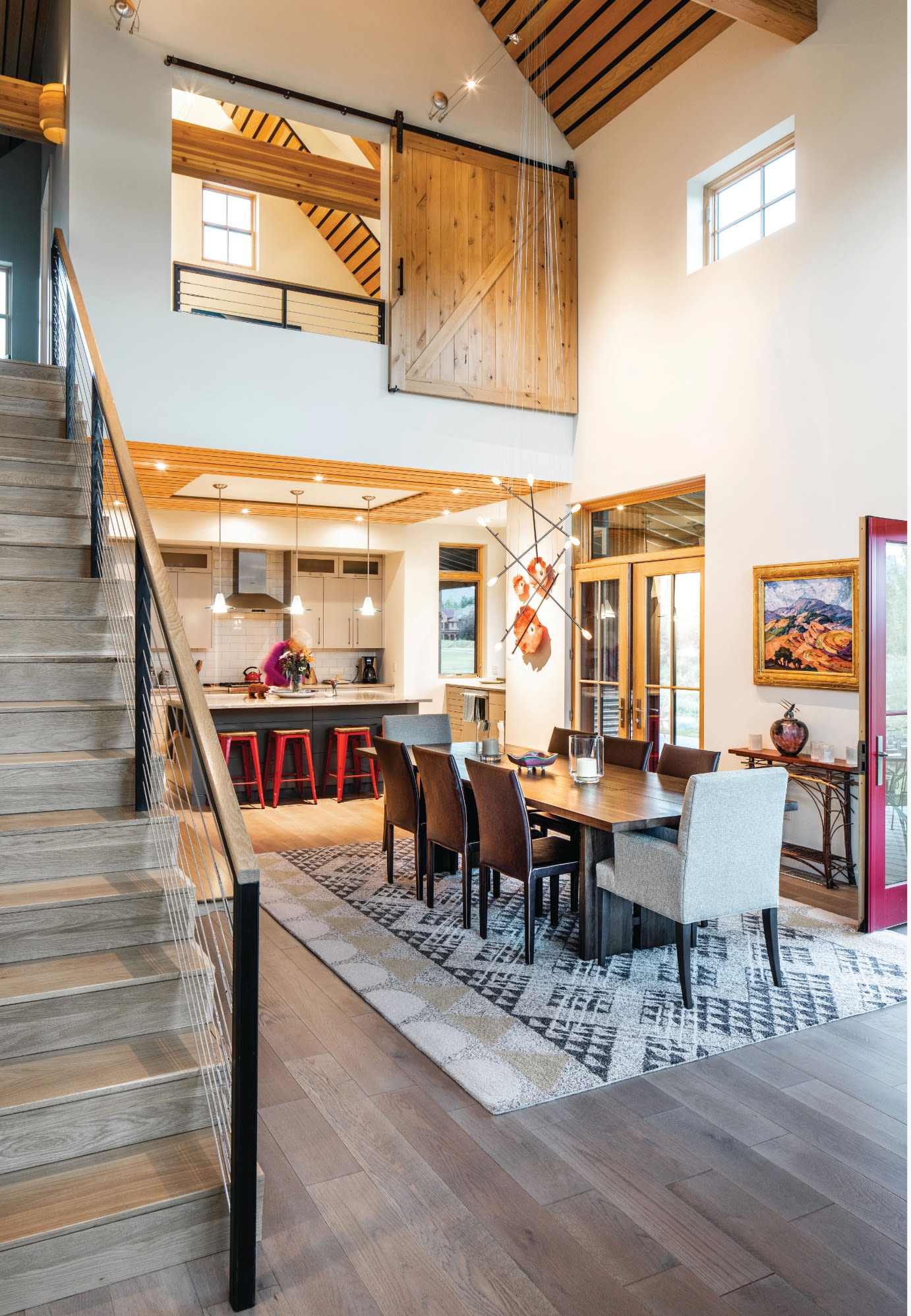 A SENSE OF PLACE. Inside, the lofty barn configuration of the great room continues the dialog with the property’s underlying history. “My affection for Colorado vernacular forms goes way back, and the exposed functional beams fit into the agricultural context of the surrounding ranch land,” Teague says. A barn door suspended above the kitchen—another agricultural nod—slides to close off the family room for privacy and noise reduction.