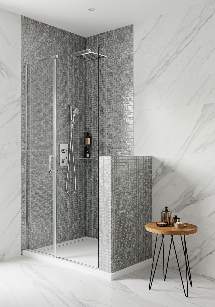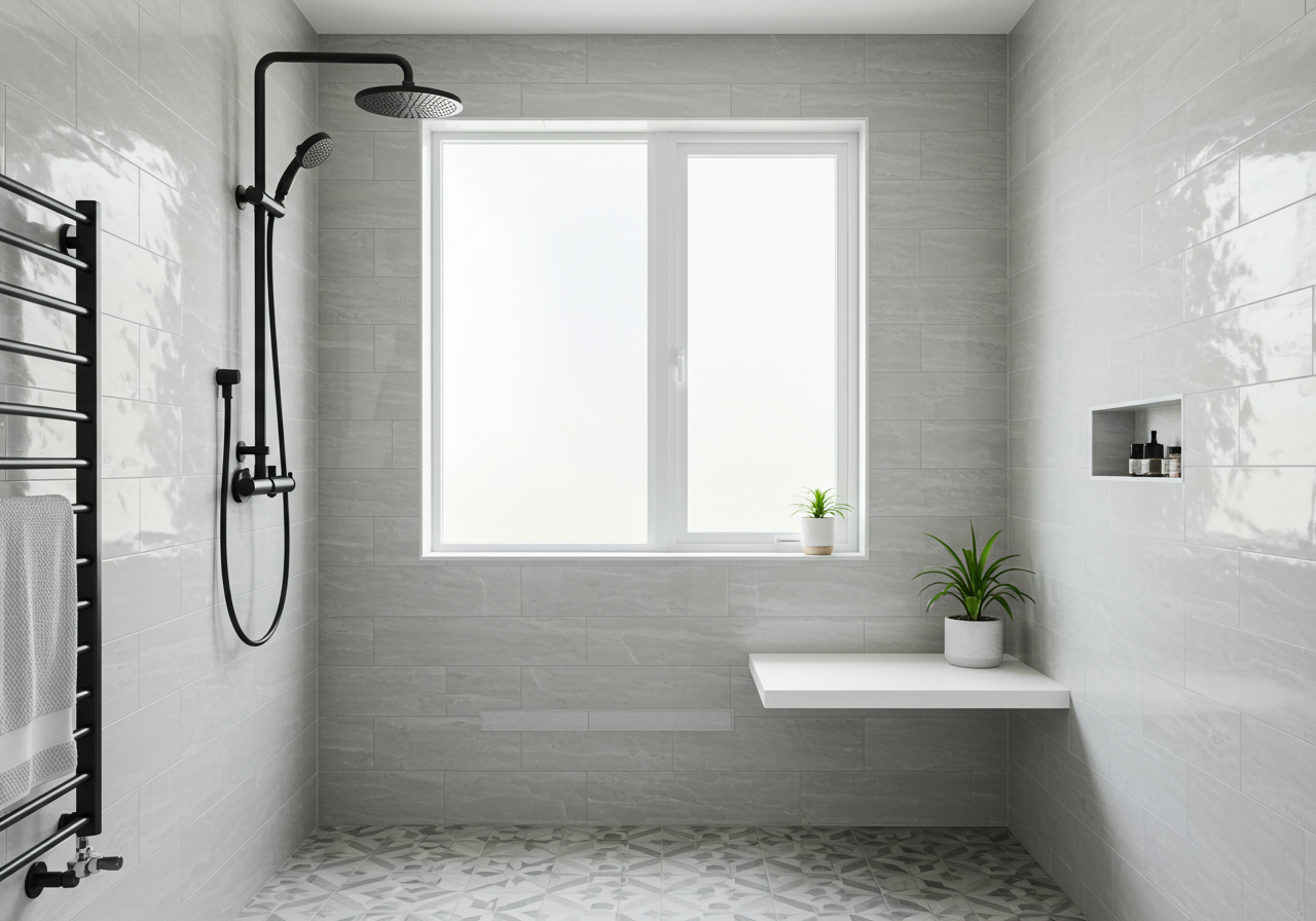 Houzz readers are frequently concerned about draftiness in open showers. In this case, the homeowners have a heated floor that they keep at 74 degrees year-round and a bathroom exhaust fan with a built-in heater. In colder climates, well-insulated walls and floors are also key to keeping drafts out of an open shower.