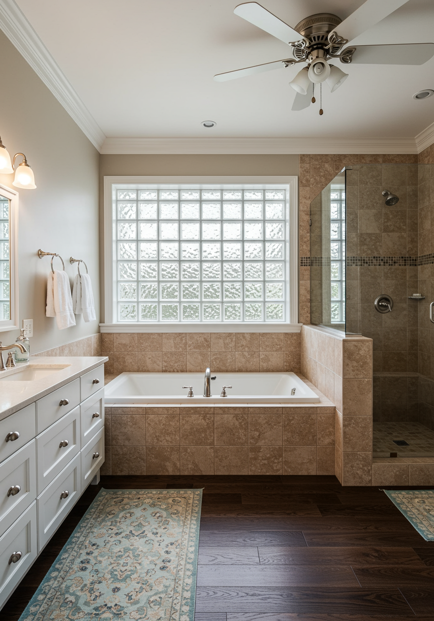 Before: A large jetted tub hogged a lot of space in this Dallas bathroom. To top it off, the jet features no longer worked. The vanity shown in the photo is one of two; the other one was located along an adjacent wall. A ceiling fan, soffit and glass block window dated the room, while tile and beige paint made it feel dingy.