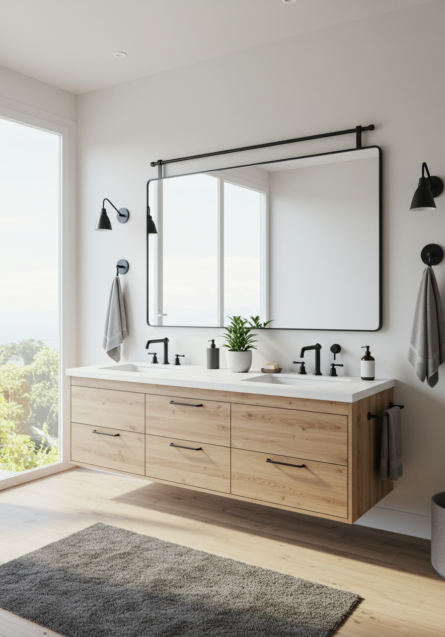 The wood on the vanity adds warmth to the space. The long lines of the bottom shelf, thick countertop and ledge accentuate its extra-long dimensions. Mirrors that air kiss the ceiling and double globe sconces add to the spa-like feel.