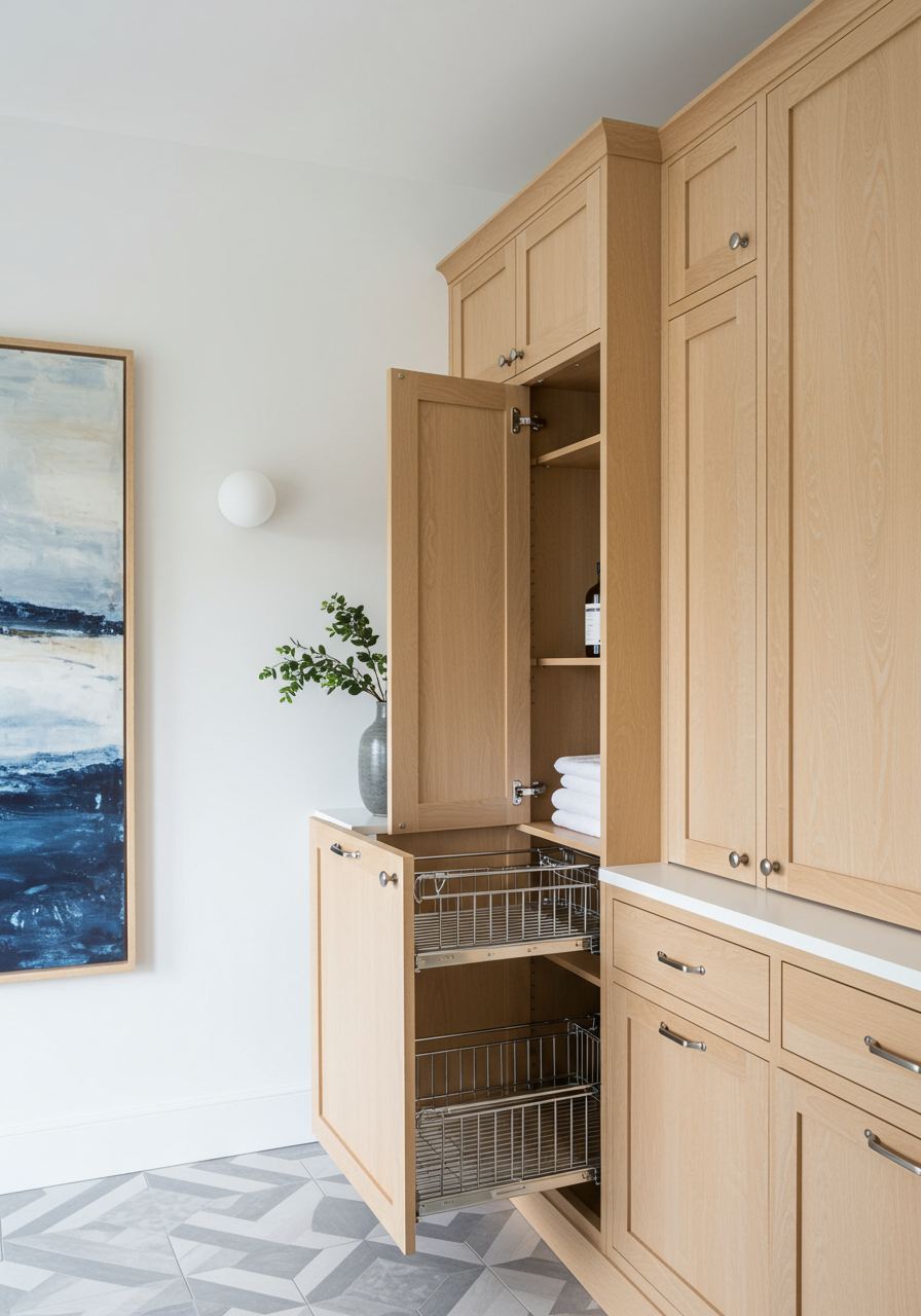 Another spa-like touch is a place to throw used towels and other laundry. Two pull-out hampers in a storage tower make it easy to keep the room looking tidy.