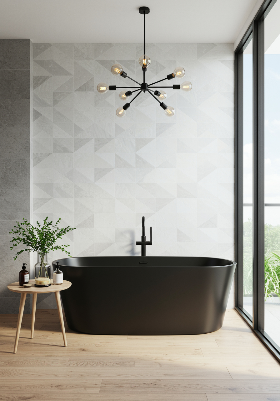 After: The homeowners’ idea of spa-like was streamlined contemporary style. This meant making the room feel light and visually pleasing. A statement freestanding tub in a graphite color anchors the spot in front of the window. An industrial-style chandelier hangs overhead. A wood stool and white oak-like tile floors add organic touches.
