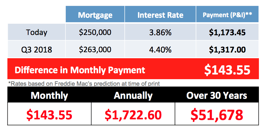 If home prices appreciate by the 5.2% predicted by CoreLogic over the next twelve months, here is a simple demonstration of the impact an increase in interest rate would have on the mortgage payment of a home selling for approximately $250,000 today: