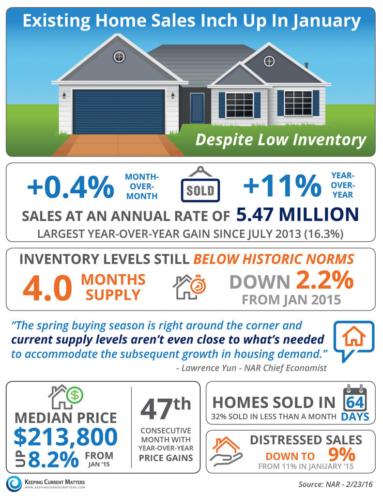 - Lawrence Yun, NAR’s Chief Economist, warns: “The spring buying season is right around the corner and current supply levels aren’t even close to what’s needed to accommodate the subsequent growth in housing demand.”