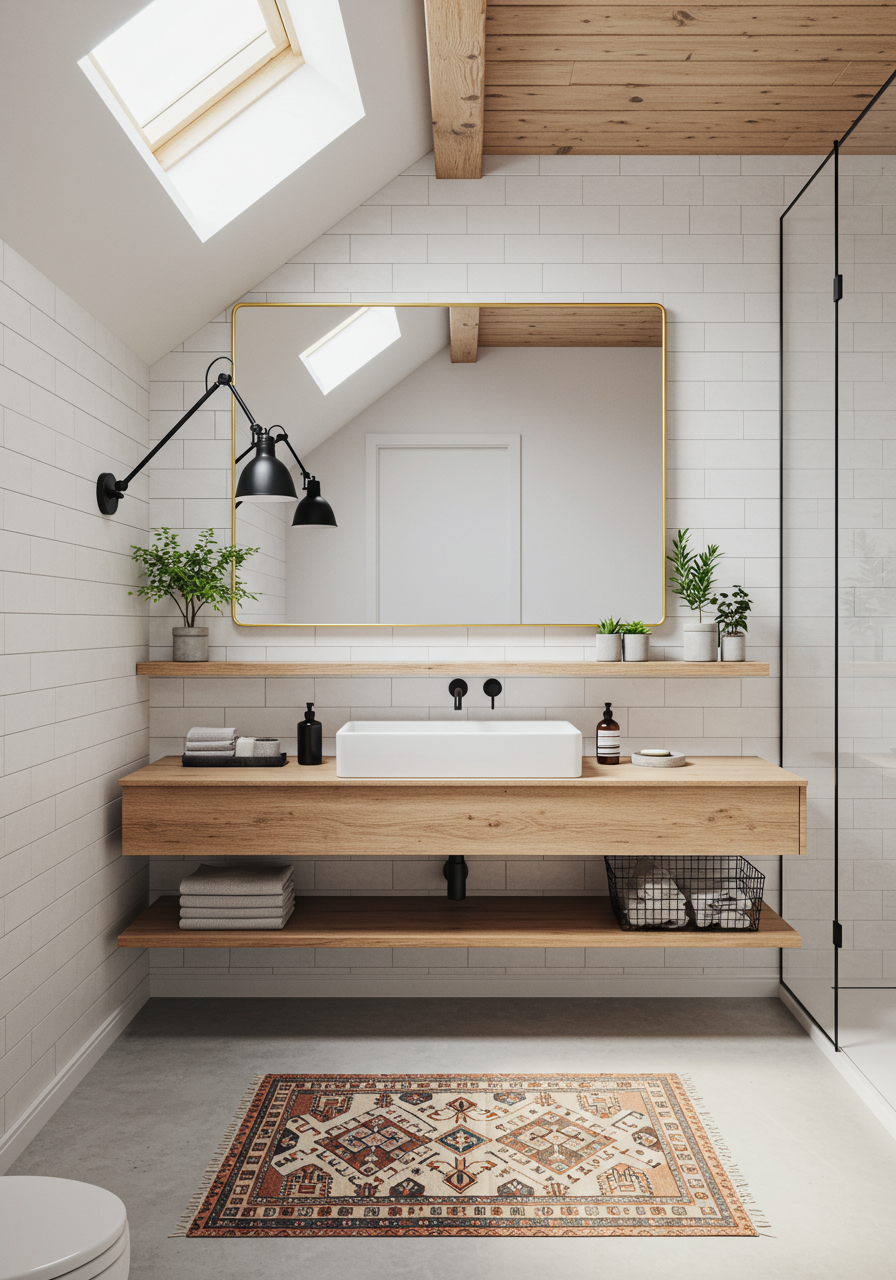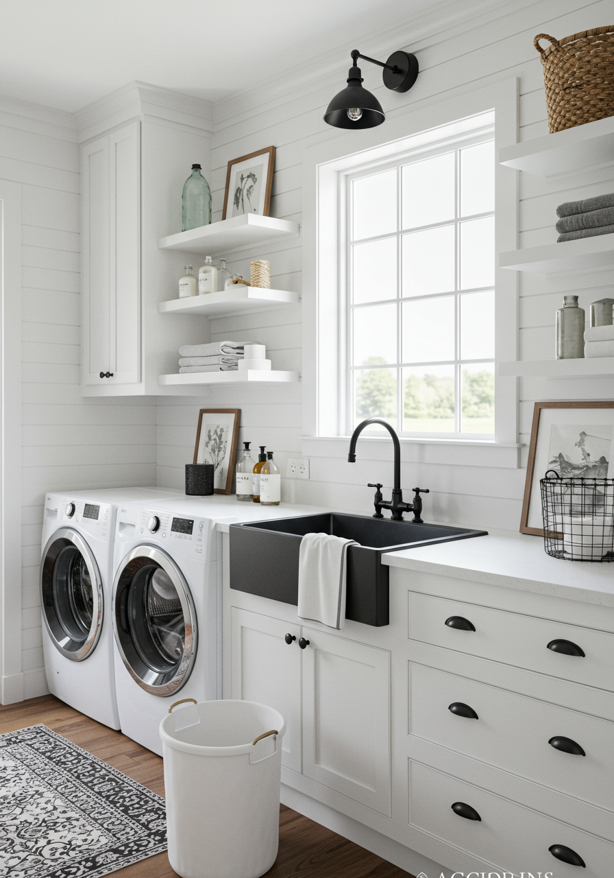 Stacks of fresh hand towels and a hamper for dirty towels, or a roll of paper towels and a wastebasket