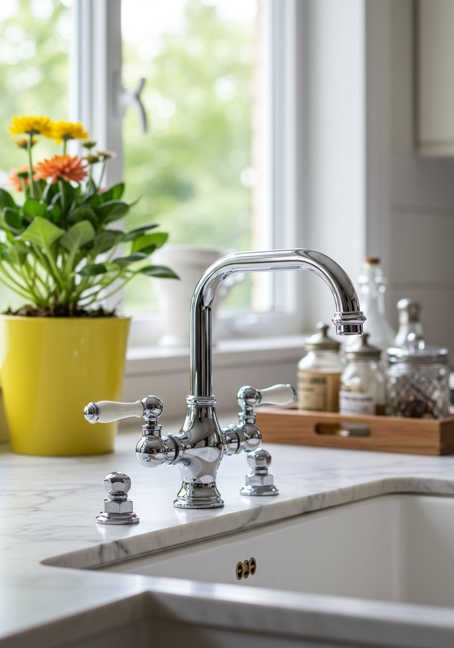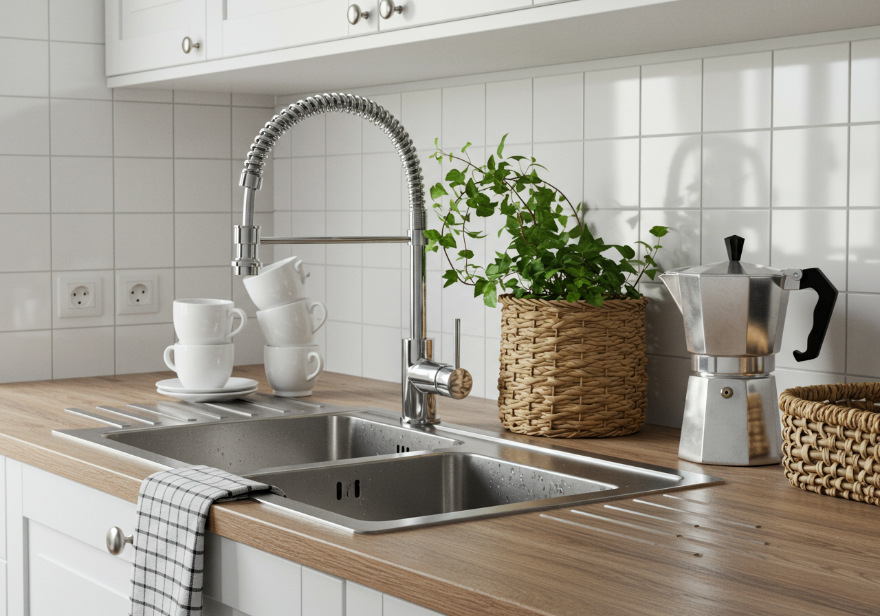 A container of sanitizing wipes for daily cleaning of faucets and counters
