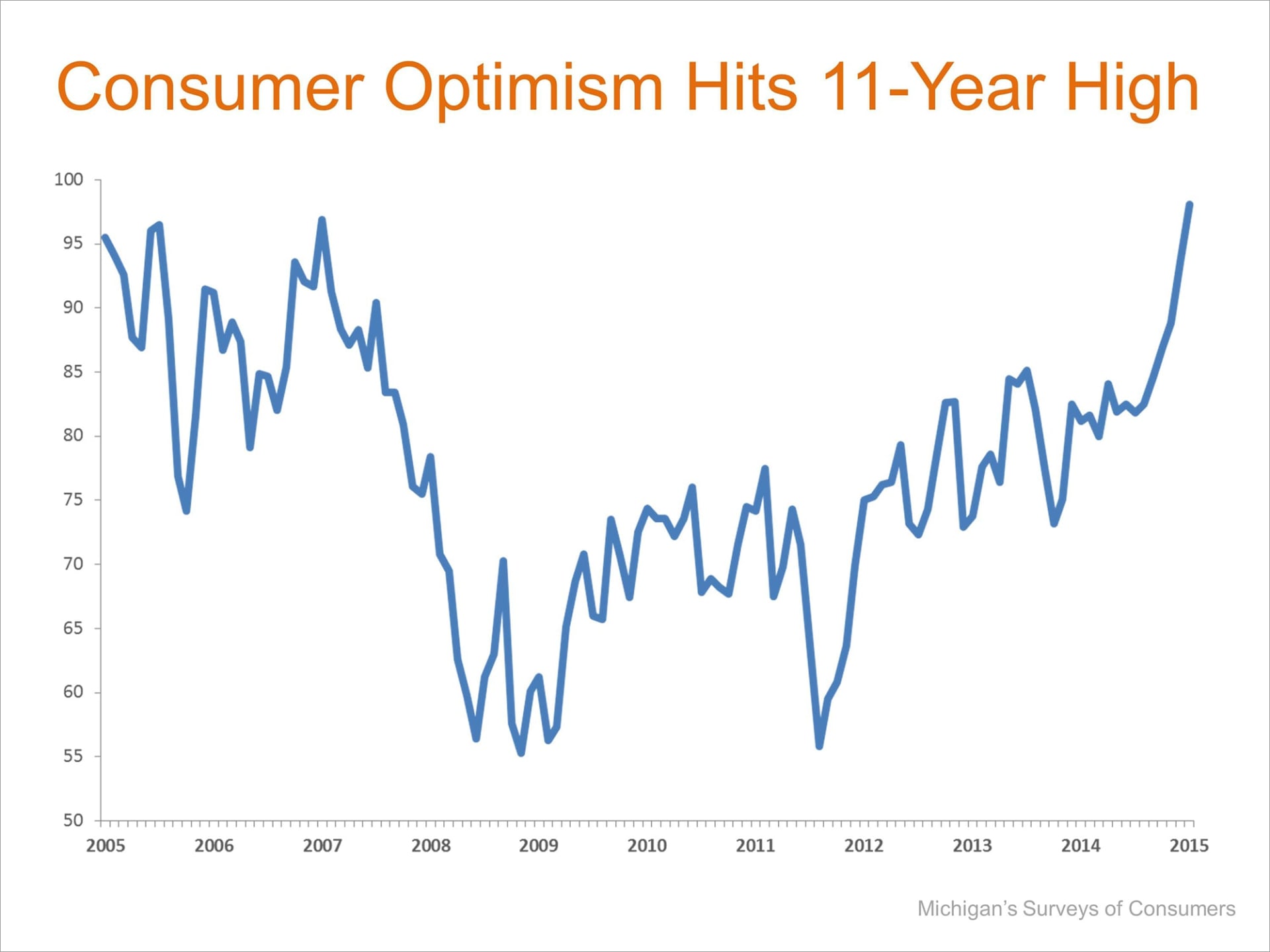 “Consumer optimism reached the highest level in the past decade in the January 2015 survey… Consumers judged prospects for the national economy as the best in a decade, with half of all consumers expecting the economic expansion will continue for another five years. The anticipated strength in the overall economy has been accompanied by more favorable income and employment expectations.”