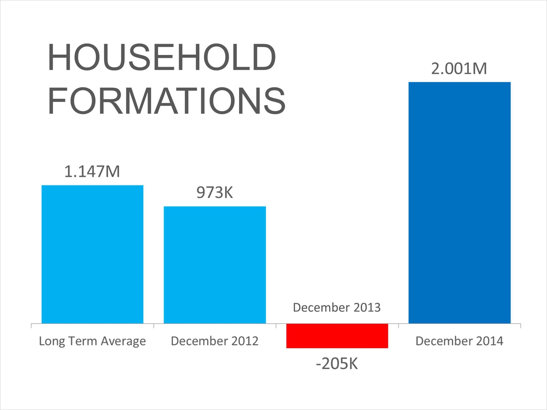 As all consumers are feeling more optimistic, more young adults are moving out of their parents’ basements and into a residence of their own. The recent Census report shows that new household formations skyrocketed in 2014. Below is a chart showing the historical significance of the numbers: