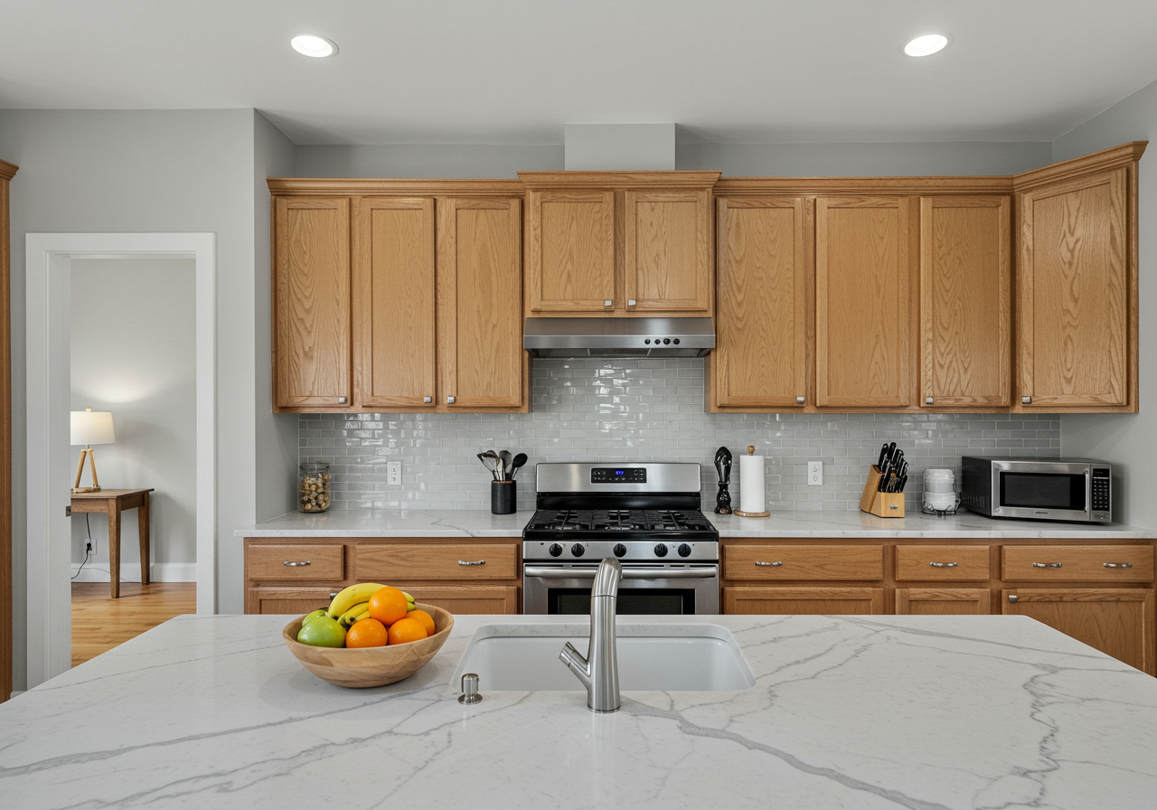 The pièce de résistance in this kitchen is the luxurious Cambria quartz surfaces. Known for their durability and elegance, these countertops provide a beautiful space for meal prep, baking, or simply gathering around to share stories and laughter.