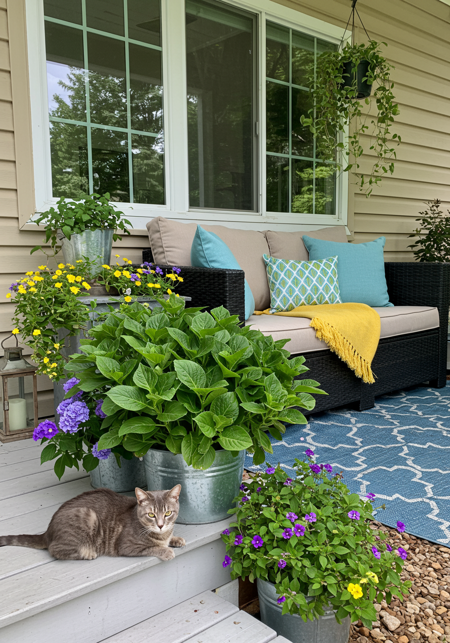Brittany furnished the space with retail finds—seating from an end-of-season sale at Target and an outdoor rug atop the gray composite decking. Blanche, one of the family felines, is a fan. "Our cats are indoor kitties, but we let them come out onto the deck with us while we are out there so they can sniff around, chase flies, and sunbathe," Brittany says.