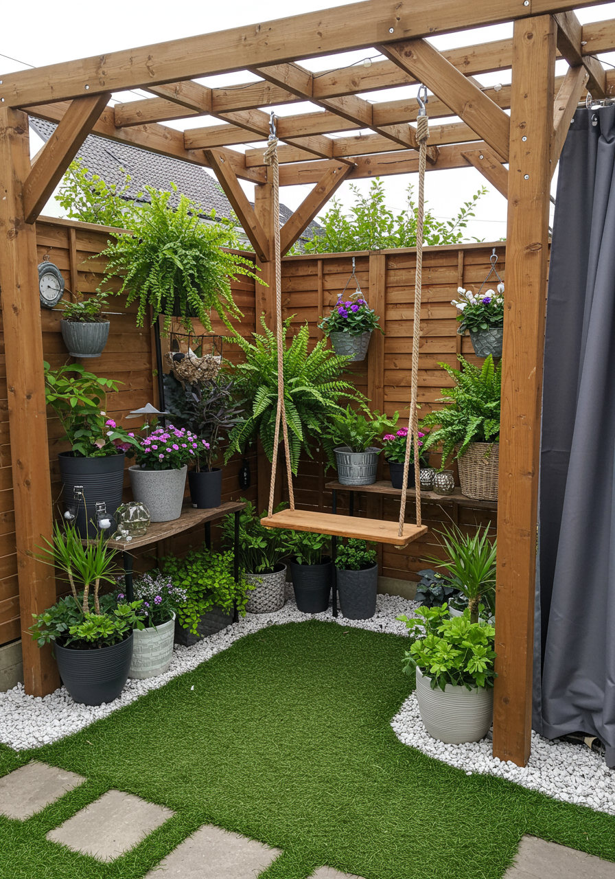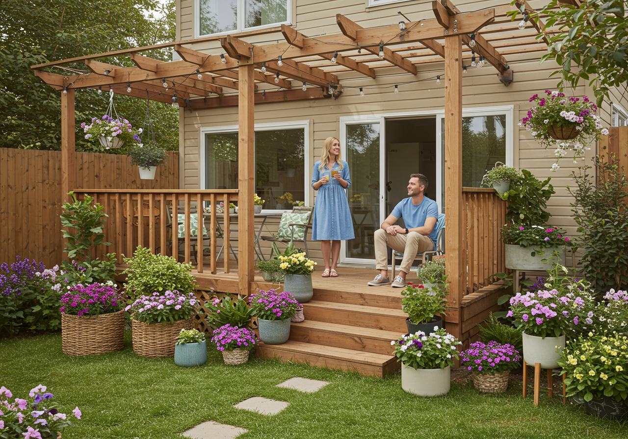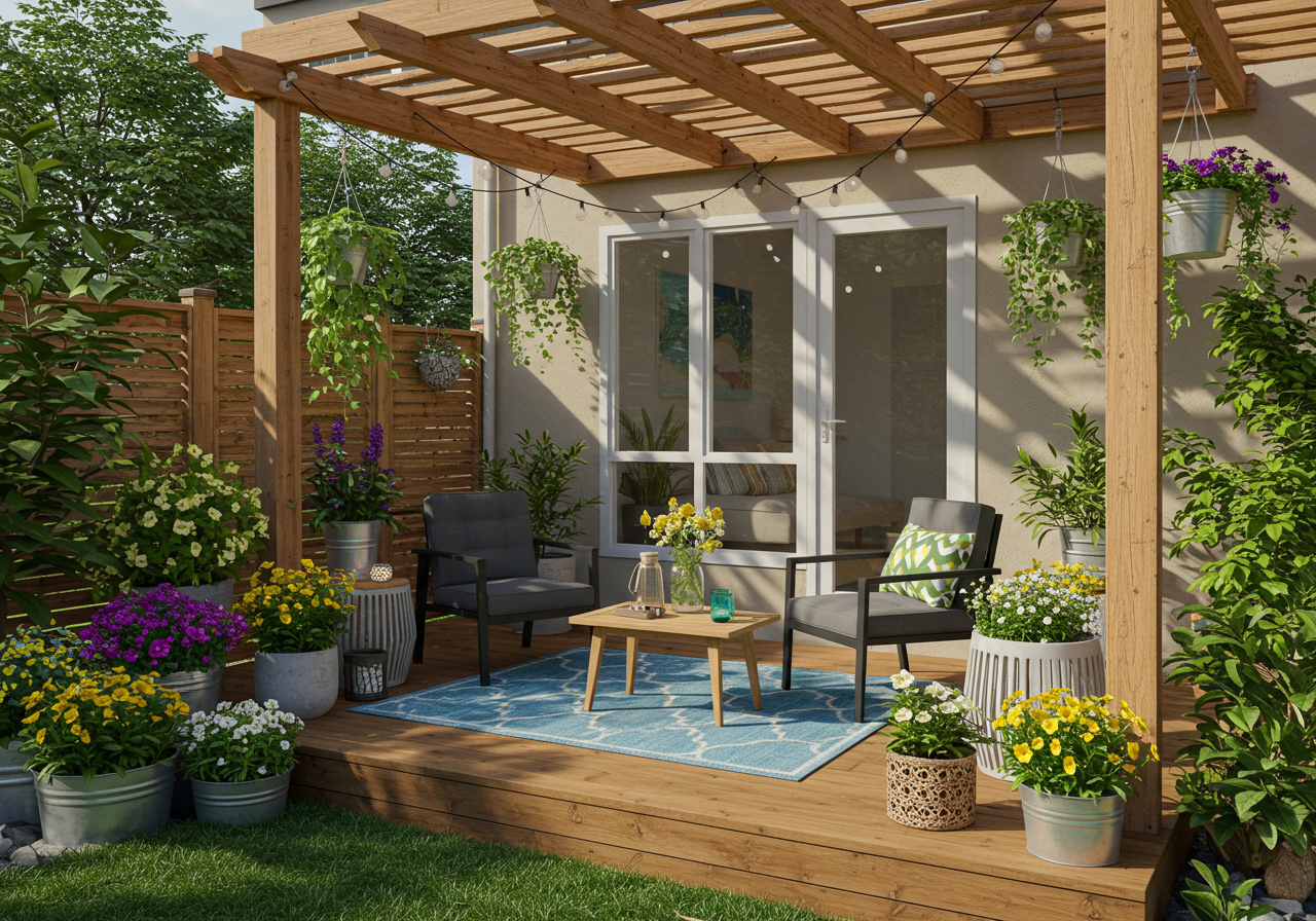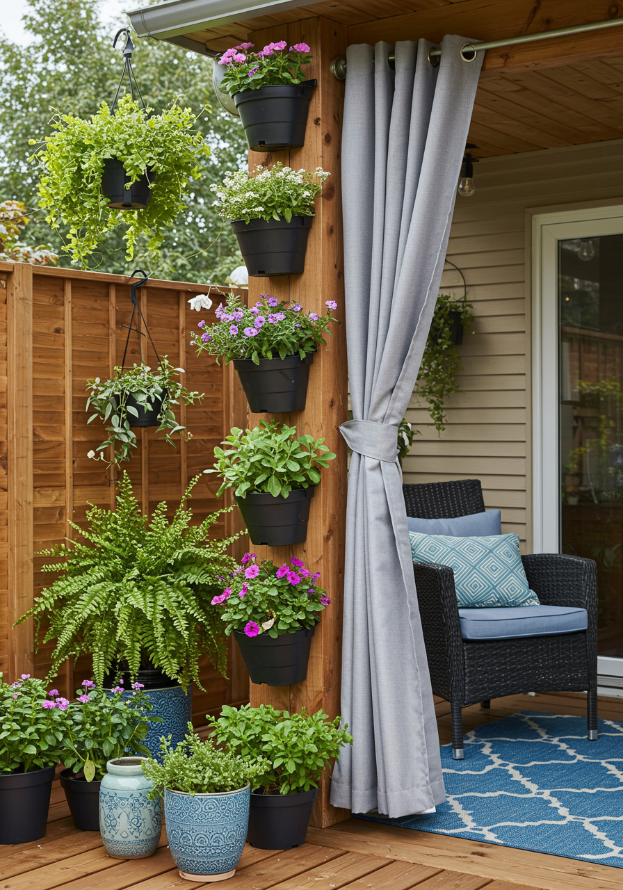 "DIY is a great way to go because most outdoor furniture pieces don't cater to smaller spaces," Brittany says. With limited floor space for furnishings and her beloved plants, she turned to vertical options. "We hung painted clay pots along our deck posts to make more space for high-sun herbs and flowers," she says. "And I have at least seven hooks for hanging baskets and one plant that vines up a corner deck post. This helps fill in the space with greenery."