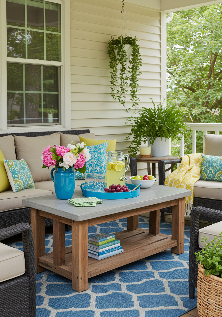 Brittany's coffee table is a simple box build topped with three concrete pavers. She finished the base using Varathane wood stain in Kona ($9, The Home Depot) and Minwax Helmsman spar urethane in satin ($17, Lowe's). "I decided not to seal the pavers so they act as coasters when you set a drink on them," she says.