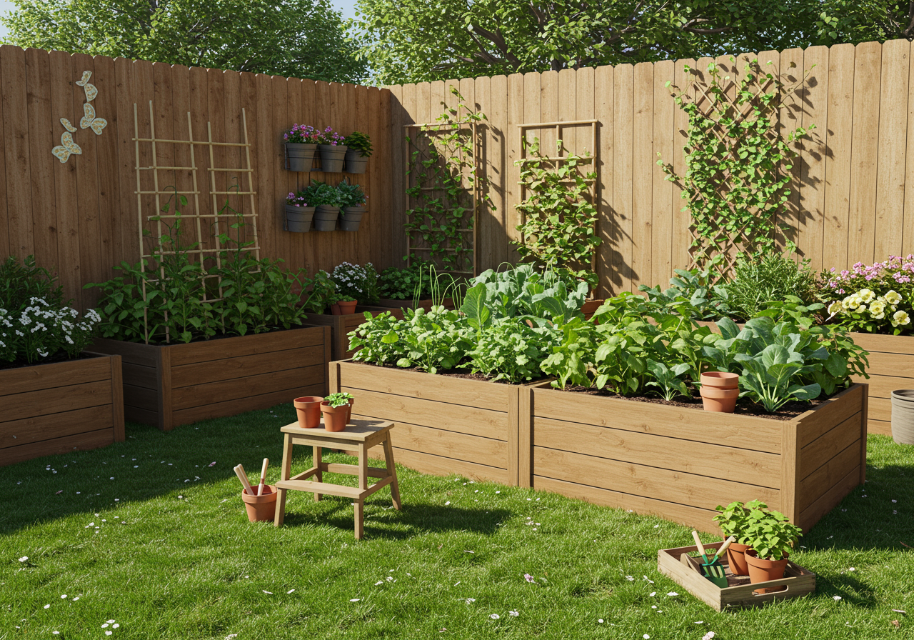 A pair of DIY raised beds (approximately 11 inches deep, 81 inches long, and 35 inches wide) produce cherry tomatoes, pickling cucumbers, and peppers in one sunny corner of the backyard. "I love plants and really want to instill that in my daughter as well," Brittany says, "so I love taking her out there to 'help' me plant, water, and pick things from the garden."