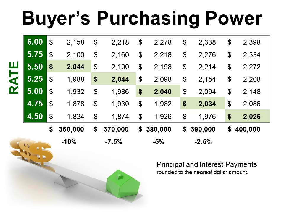 However, sellers should realize that waiting to make the move while mortgage rates are increasing probably doesn’t make sense. As rates increase, the price of the house you can buy will decrease. Here is a chart detailing this point:
