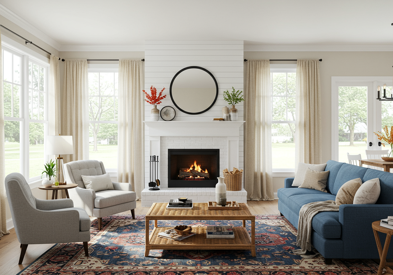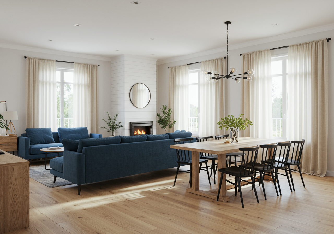 Stepping inside, the living room is open concept with a large living room, dining room, and kitchen with an island flowing seamlessly into the next. A main floor office will be great for working from home or as a homework hub. Oriented on a South facing lot this main living space has lots off natural light streaming in from windows on three sides. The living room its adorned with a shiplap flanked gas fireplace and designer box curtains throughout.