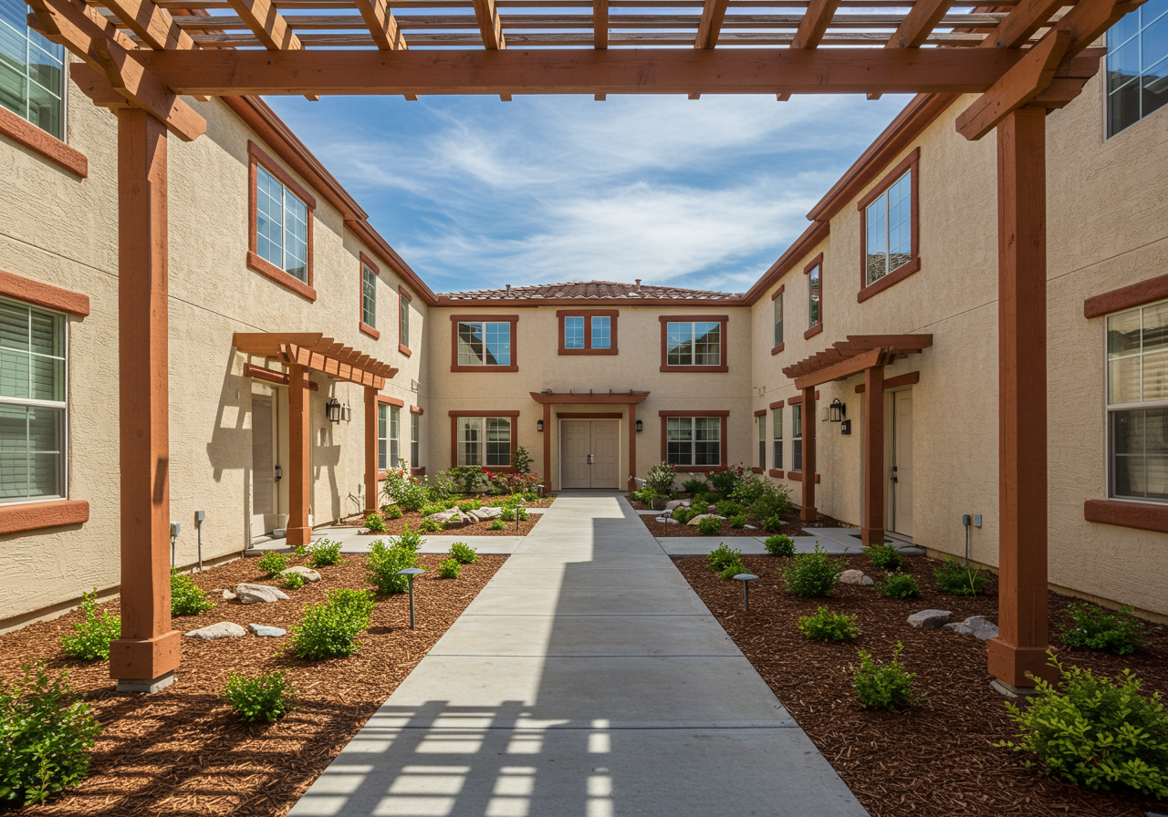 Step outside the front door into the community patio. This is a nice space to meet your neighbors, enjoy the outdoors, and it creates beautiful curb appeal.