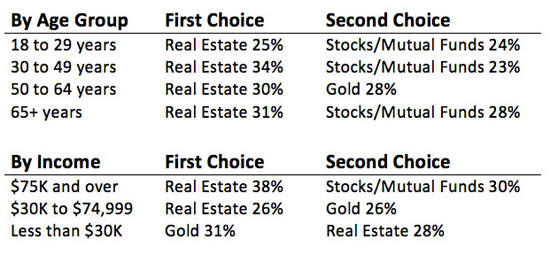 The poll also revealed that real estate was considered to be the best long term investment by all four subgroups by age and two out of three by income: