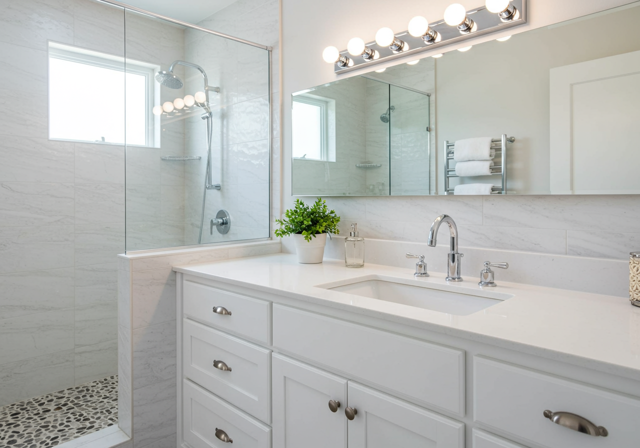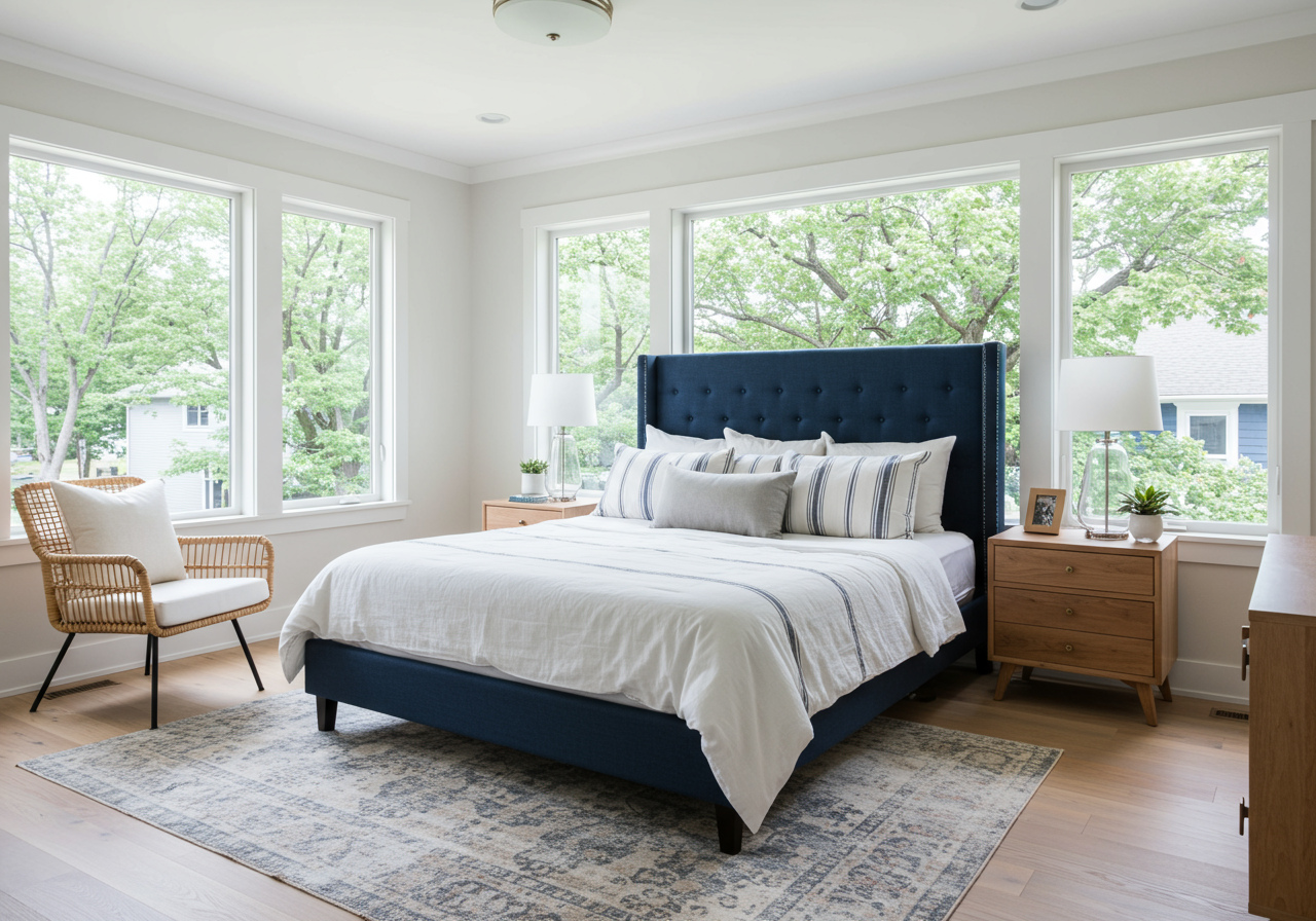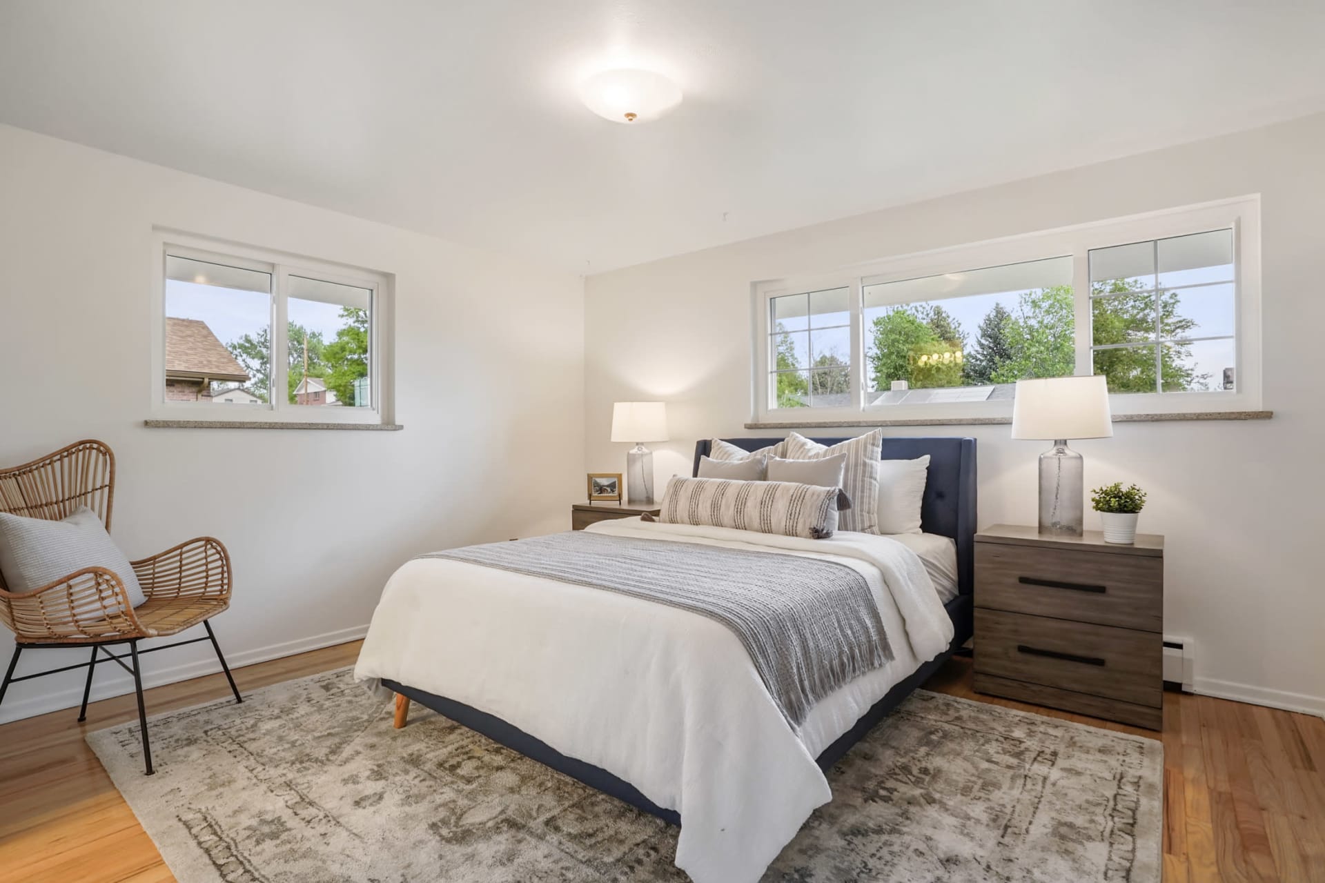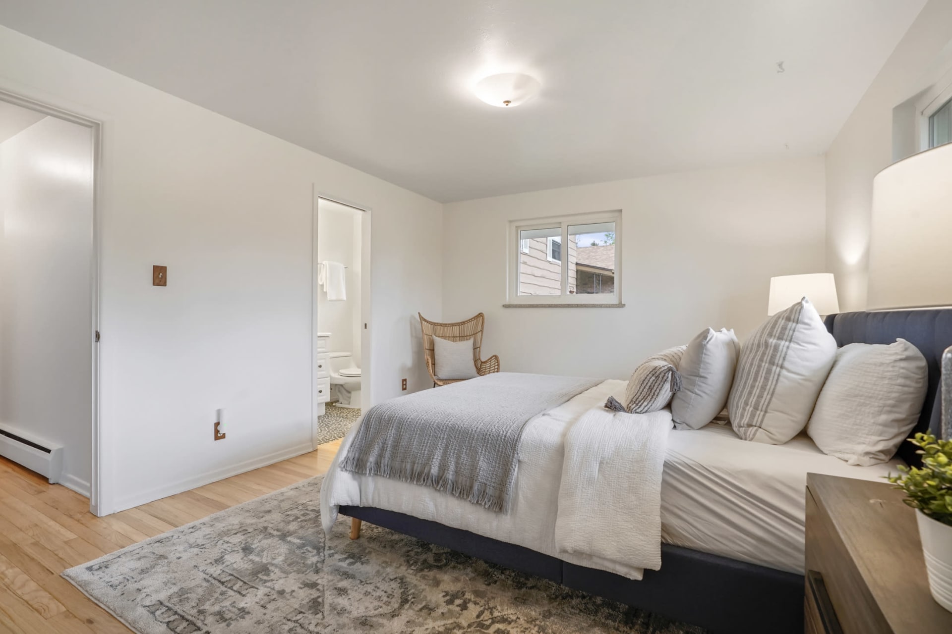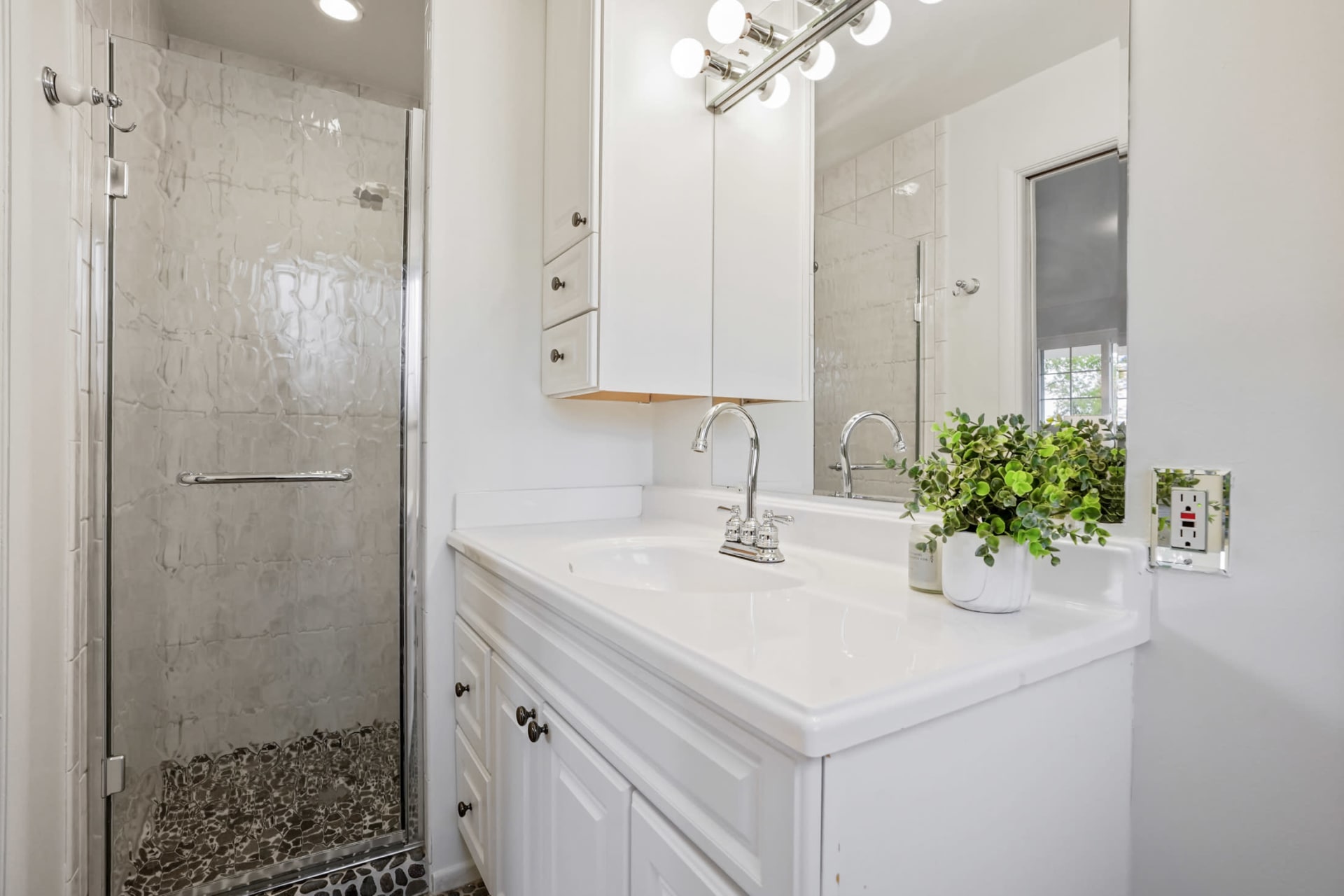 In the primary bedroom you’ll notice it has gleaming hardwood floors, easily fits a king size bed, has beautiful natural light with a remodeled bathroom featuring pebble flooring and white cabinets