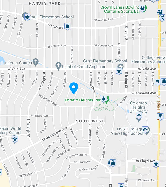 This neighborhood encompasses the Colorado lifestyle as you can enjoy mountain views, sunsets, and an active lifestyle in Loretto Heights Park only 1 block away. Harvey Park is a centrally located neighborhood where the commute to DTC, Downtown Denver, and the mountains is a breeze.