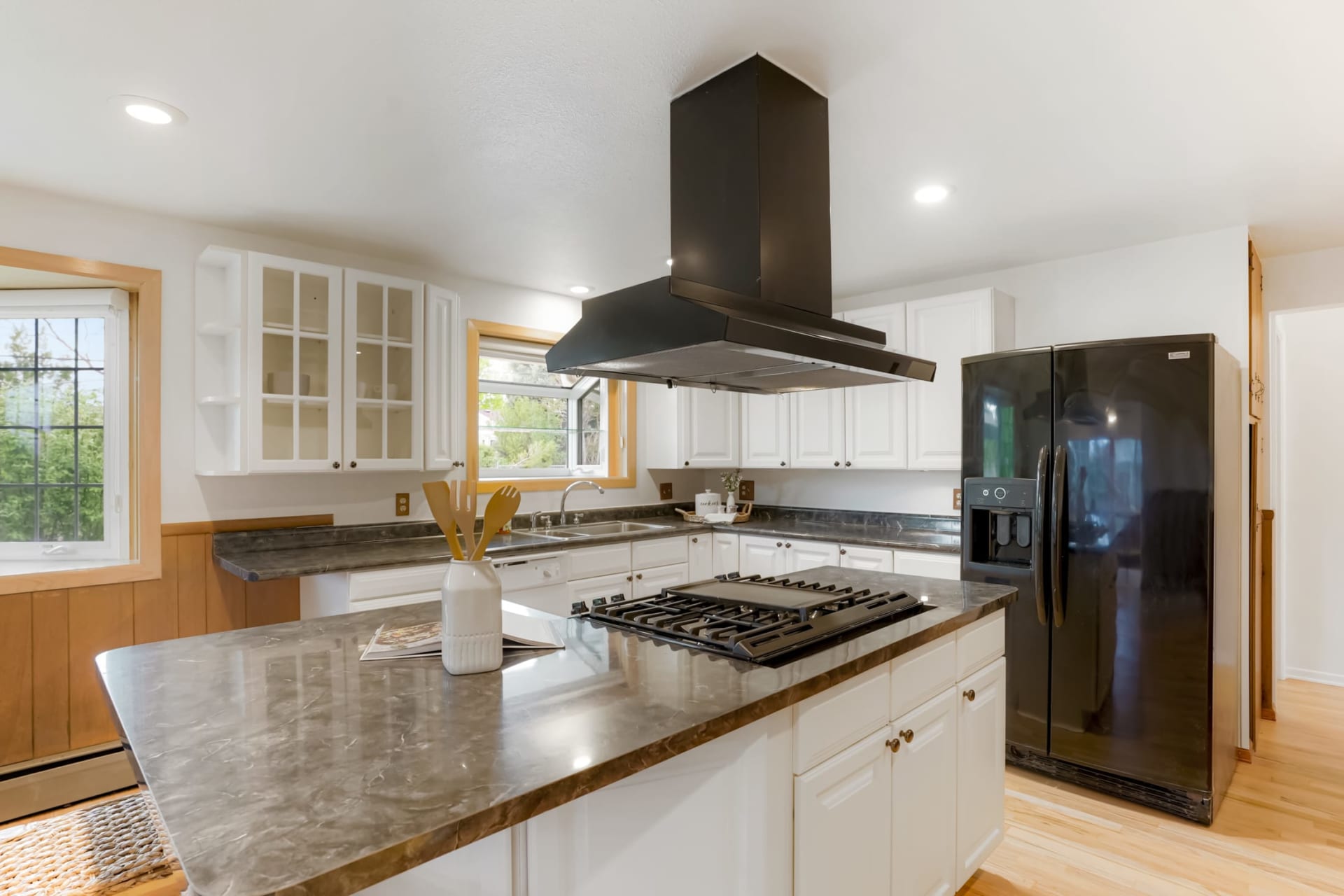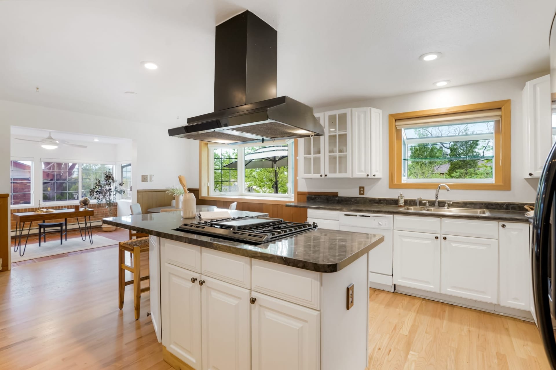 Beautifully remodeled kitchen, laundry, and sunroom/office make this home perfect for main floor living. The kitchen’s beautiful remodel features white cabinets, a central island, and dining space making this the true heart of the home. Nearby the french doors to the back patio make this an easy home to entertain in.