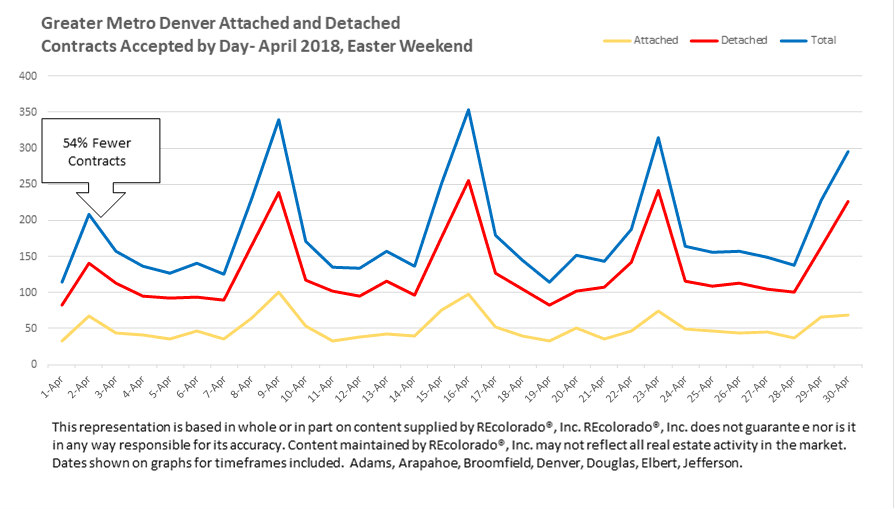 With as many people as are moving to Denver I have heard many Sellers targeting that as a good time to list. Yes there may be some people visiting but historic numbers show that on religious holiday weekends the number of contracts written drastically drops. I believe this is due to Buyers being involved with family activities and generally take a little break to celebrate. So, lets take a look at upcoming Easter. Megan Aller with First American Title has collected this data and in 2018, 2019 and expected to continue along the same trend in 2020.
