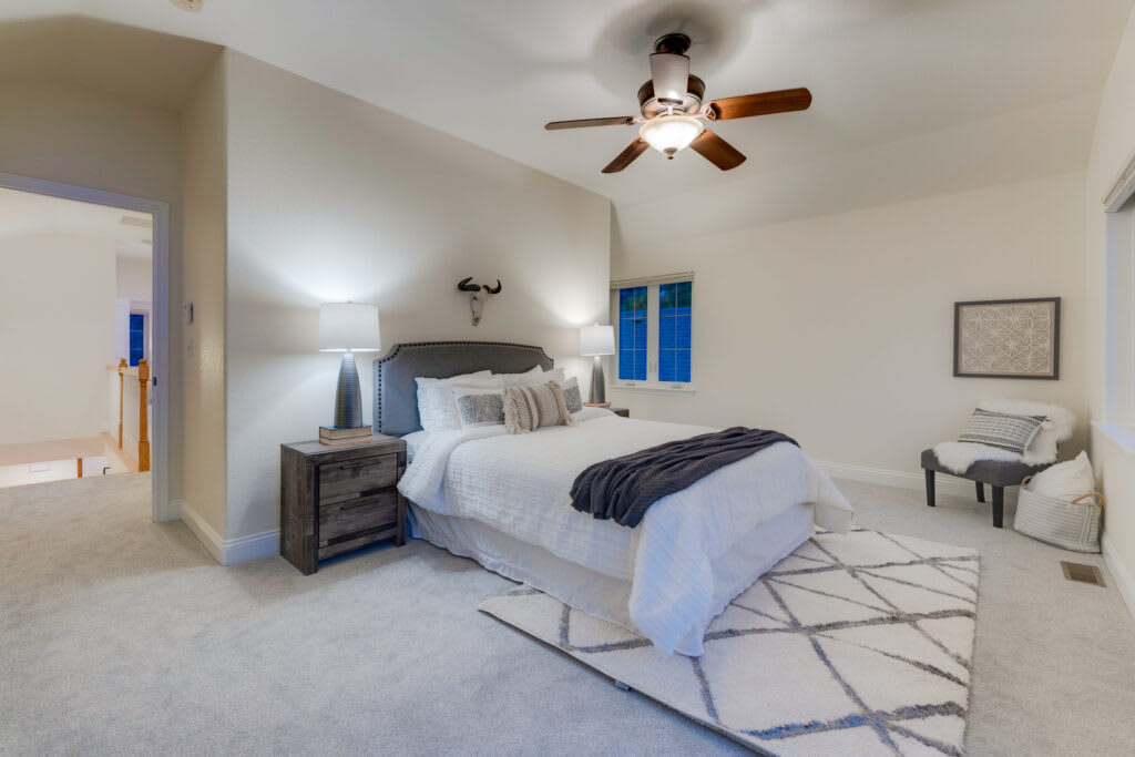 The spa-like owner’s suite features a spacious bedroom that easily fits a king-sized bed, walk-in closet, private deck with mountain views, luxury frameless steam shower, free-standing soaker tub, and radiant floor heating.