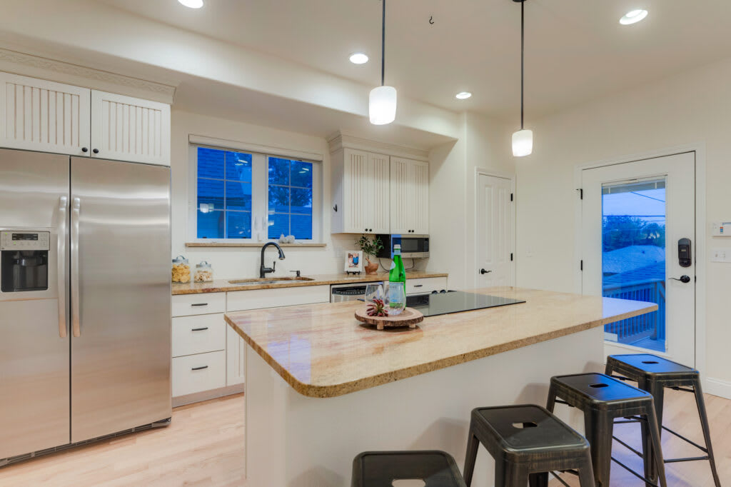 The updated kitchen boasts GE profile stainless steel appliances, slab granite countertops, eat-in kitchen, large island, and pantry.
