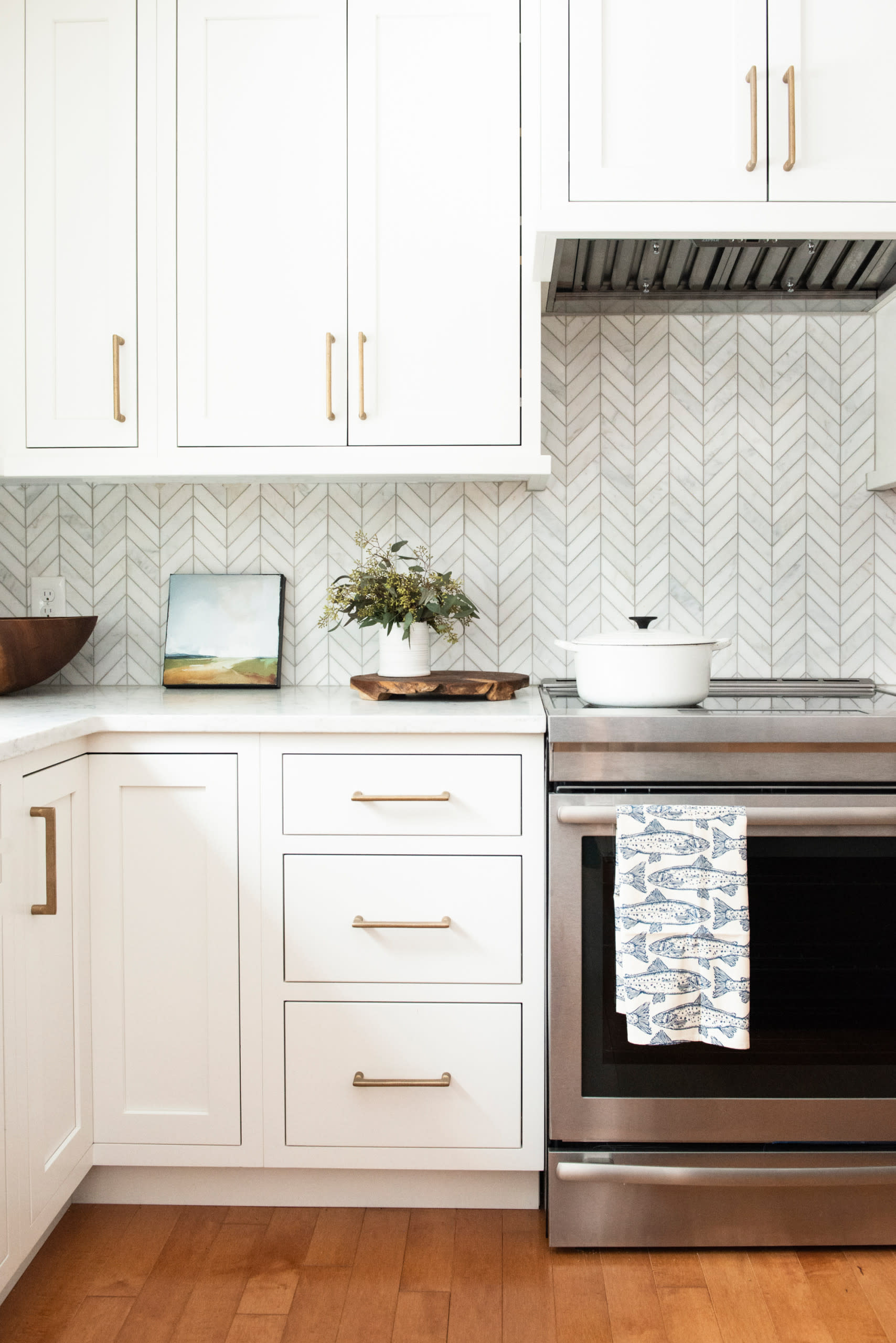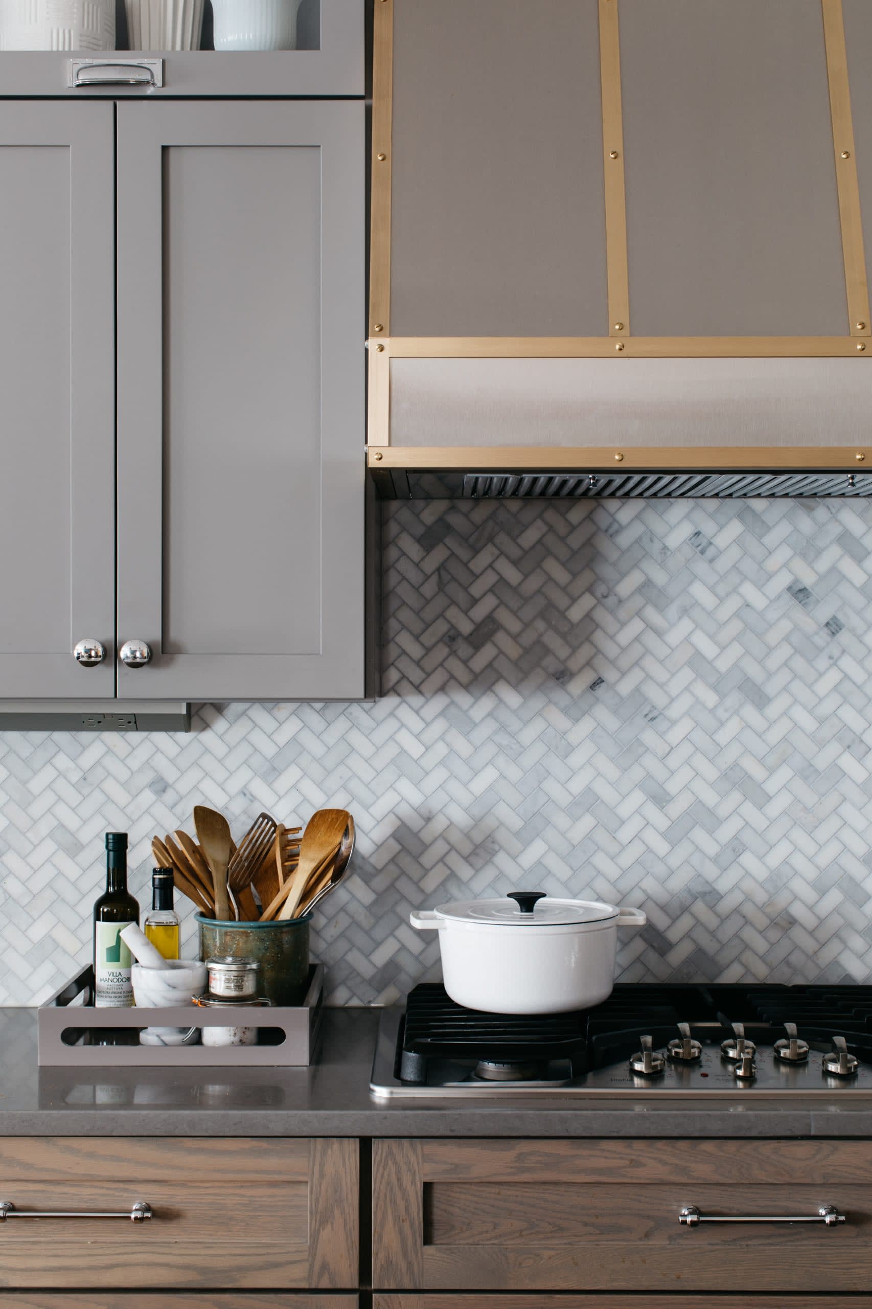If you’re looking for something with more movement in a backsplash, consider small tiles set in a herringbone or chevron pattern. Carrara marble tile in a herringbone pattern makes for an elegant backsplash in this Chicago kitchen by Honsen + Flemming Interiors.