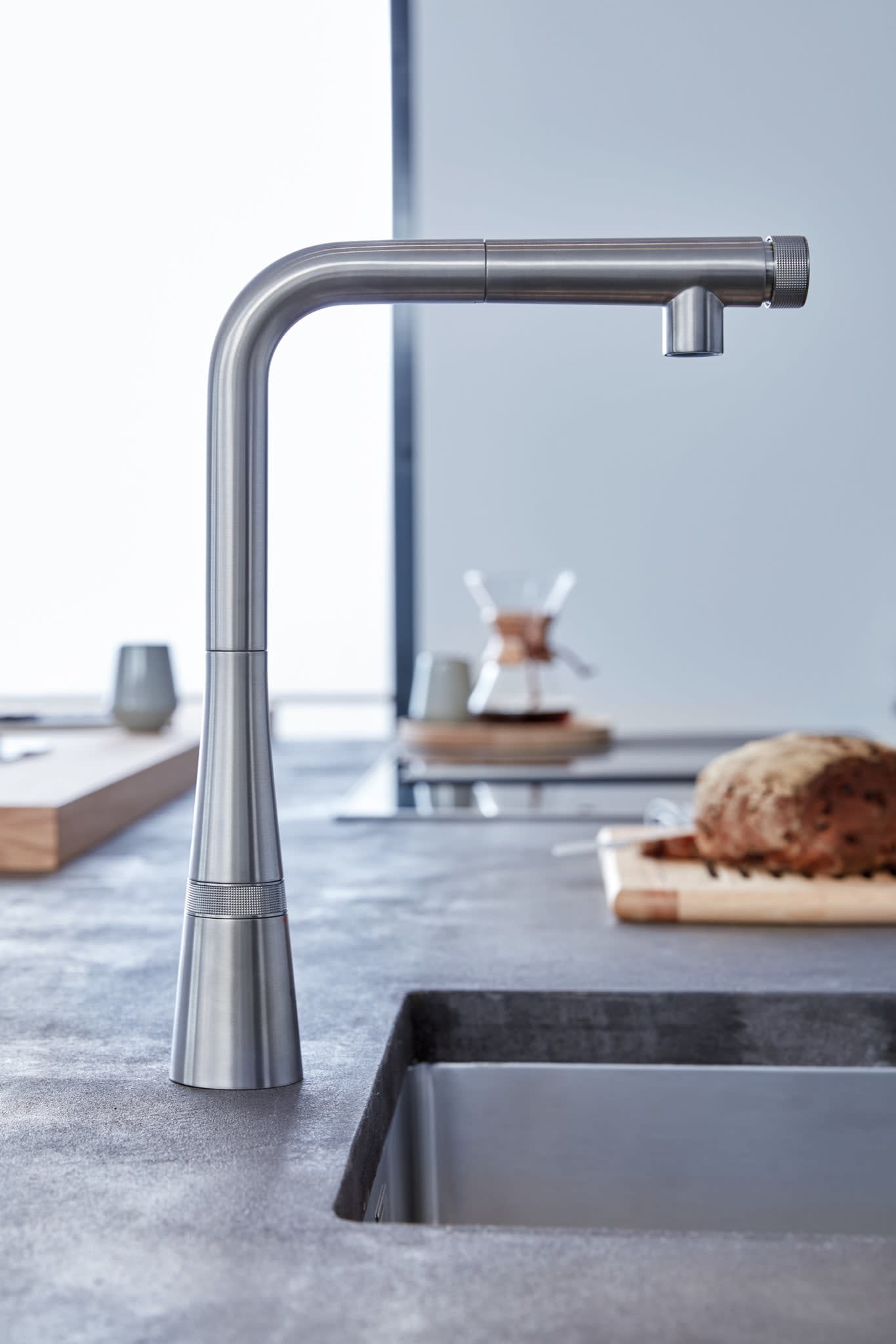 The line also offers options such as a wood-and-brass handle, shown here, highlighting another trend we’re seeing more of: mixed finishes on kitchen faucets.
