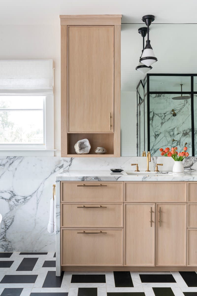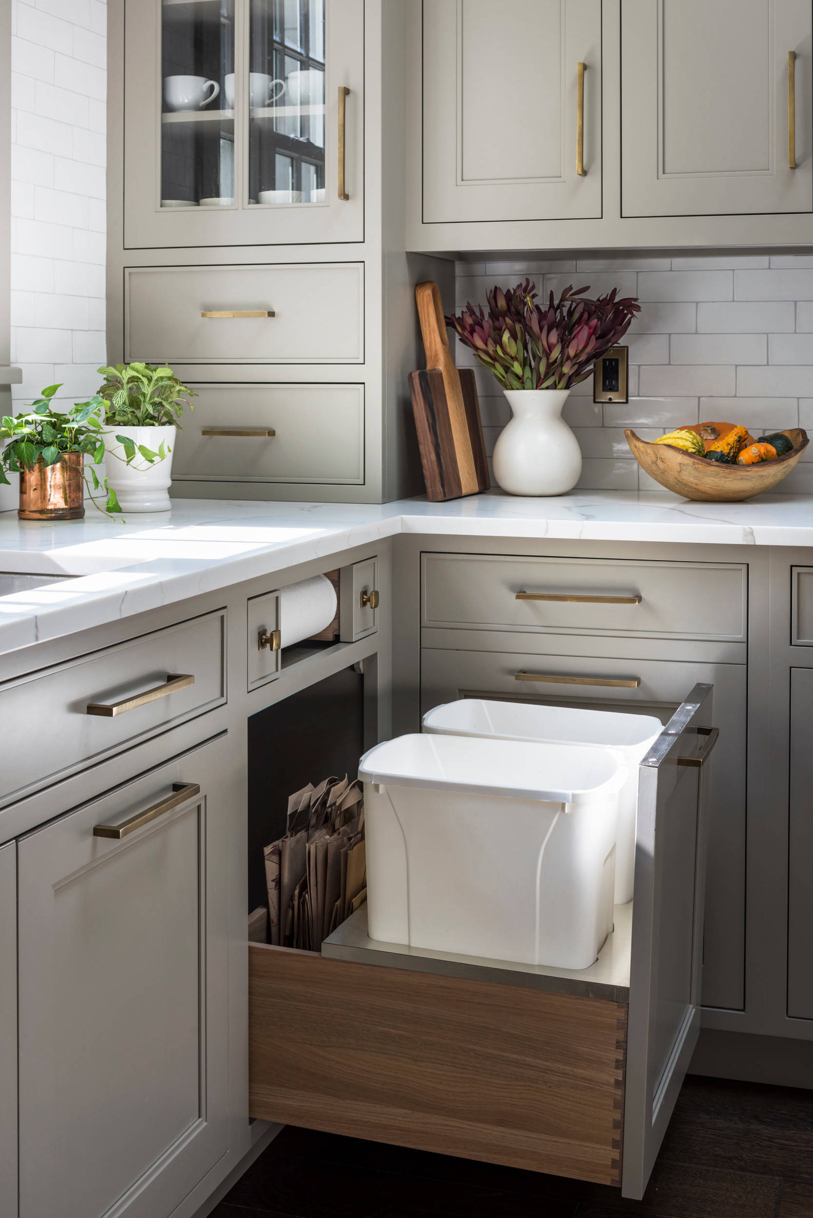 Light gray-washed red oak blends beautifully with brass hardware, multitone 6-by-6-inch marble backsplash tile, a marble island countertop and a soapstone perimeter countertop. “Using wood instead of white on the cabinets let me bring in white tones with other materials in the room without it feeling too white,” Fischer says.