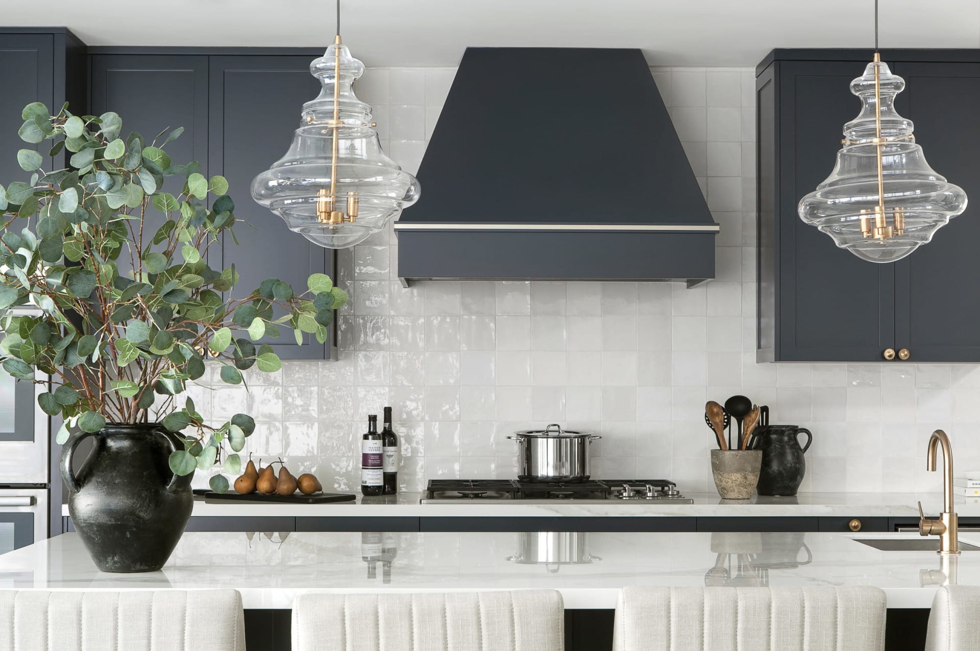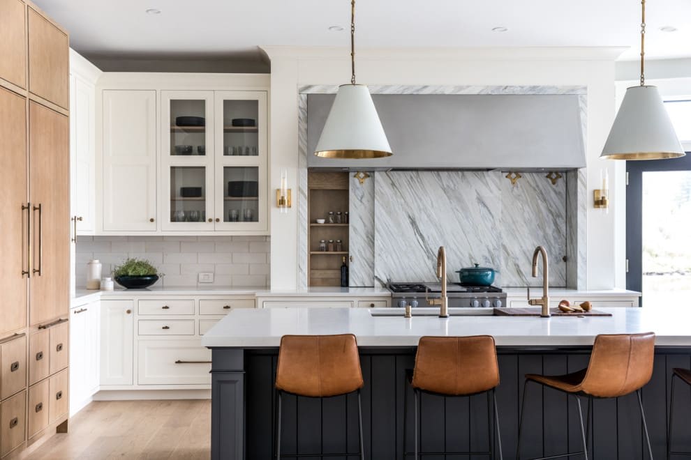 Kelsey Leigh Design Co. For this kitchen in Oklahoma City, designer Kelsey Leigh created dressed-up style with painted wall paneling and gilded-frame artwork beneath gallery-style light fixtures. A quartz slab backsplash that matches the countertop leads to a white range hood, resembling a white-tie tuxedo outfit.