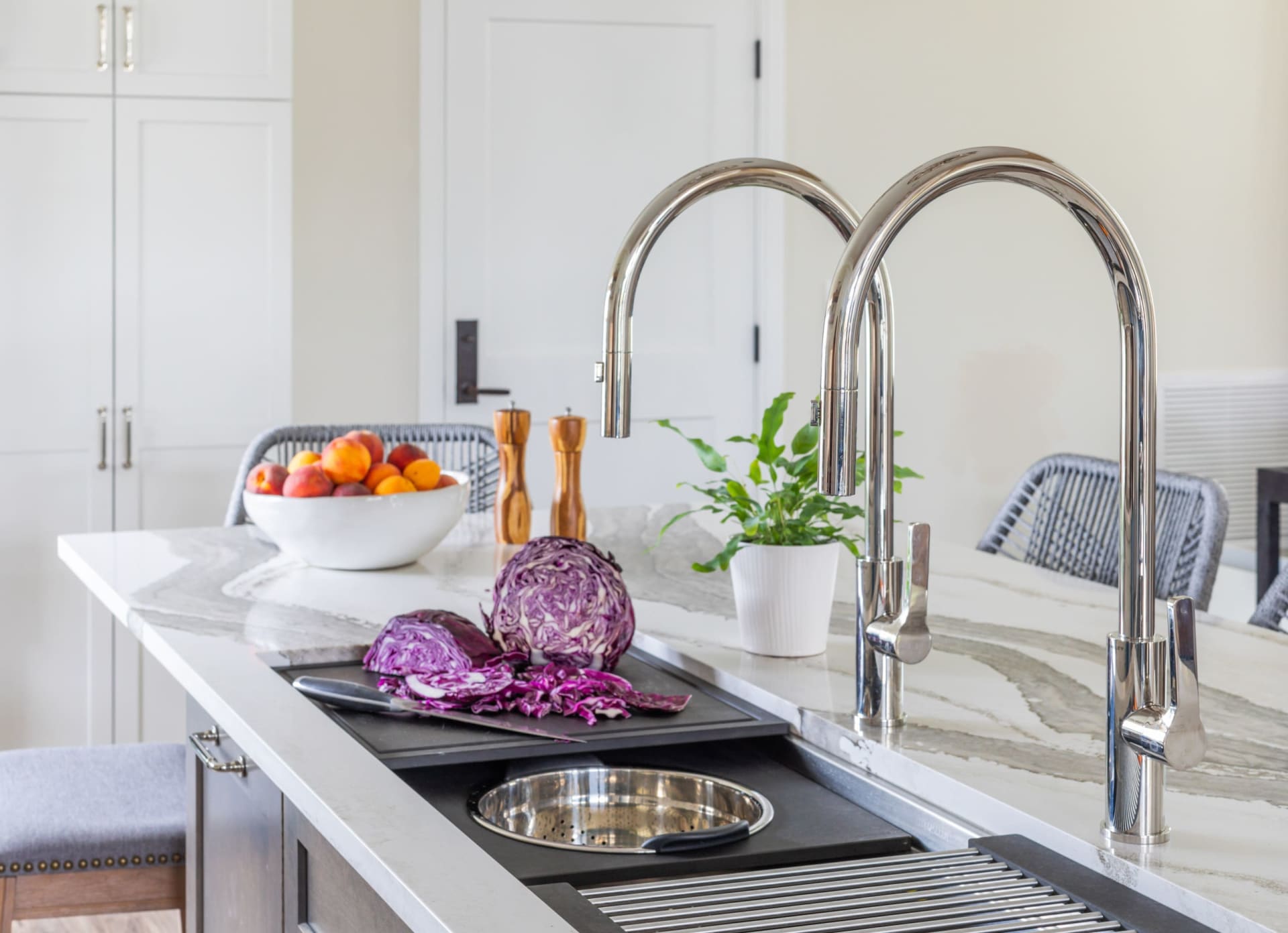 As kitchens expand into multiple zones, the kitchen sink zone is following suit with what’s known as a workstation. Though relatively new to the market, workstations are quickly catching on. Built-in ledges support movable components such as a cutting board, colander and racks for draining and drying. It combines functions you might perform elsewhere in the kitchen, limiting the need to move back and forth between those areas.