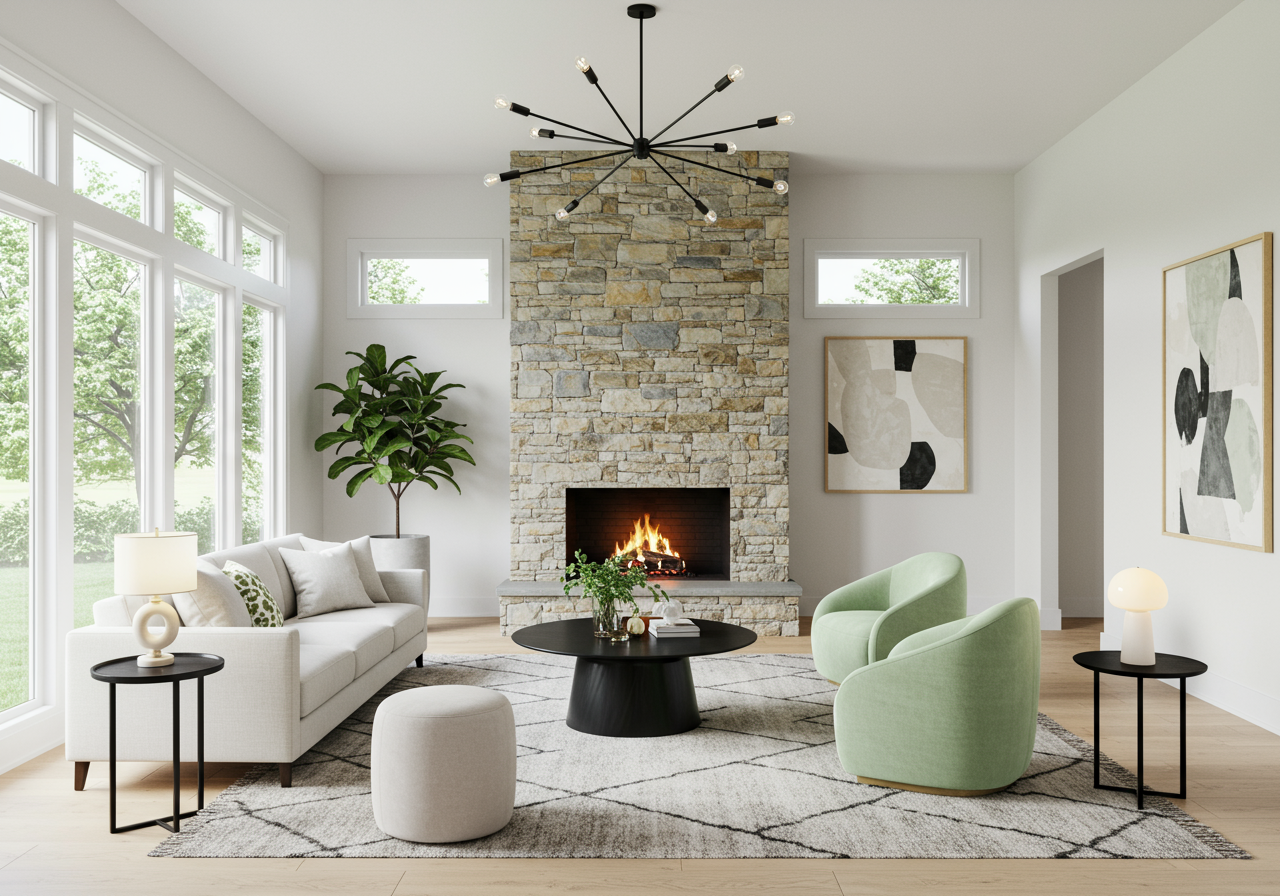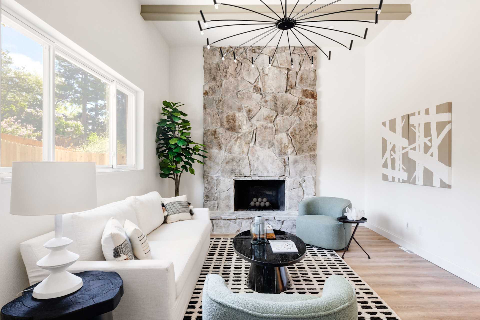 The two story living room has soaring 12 foot ceilings, is flooded with natural light, and includes a stunning rock fireplace.