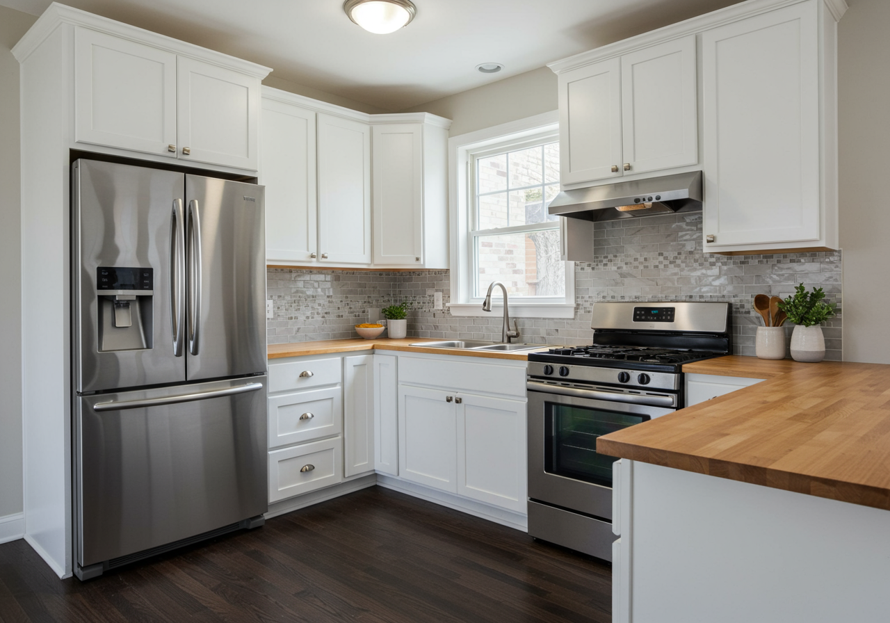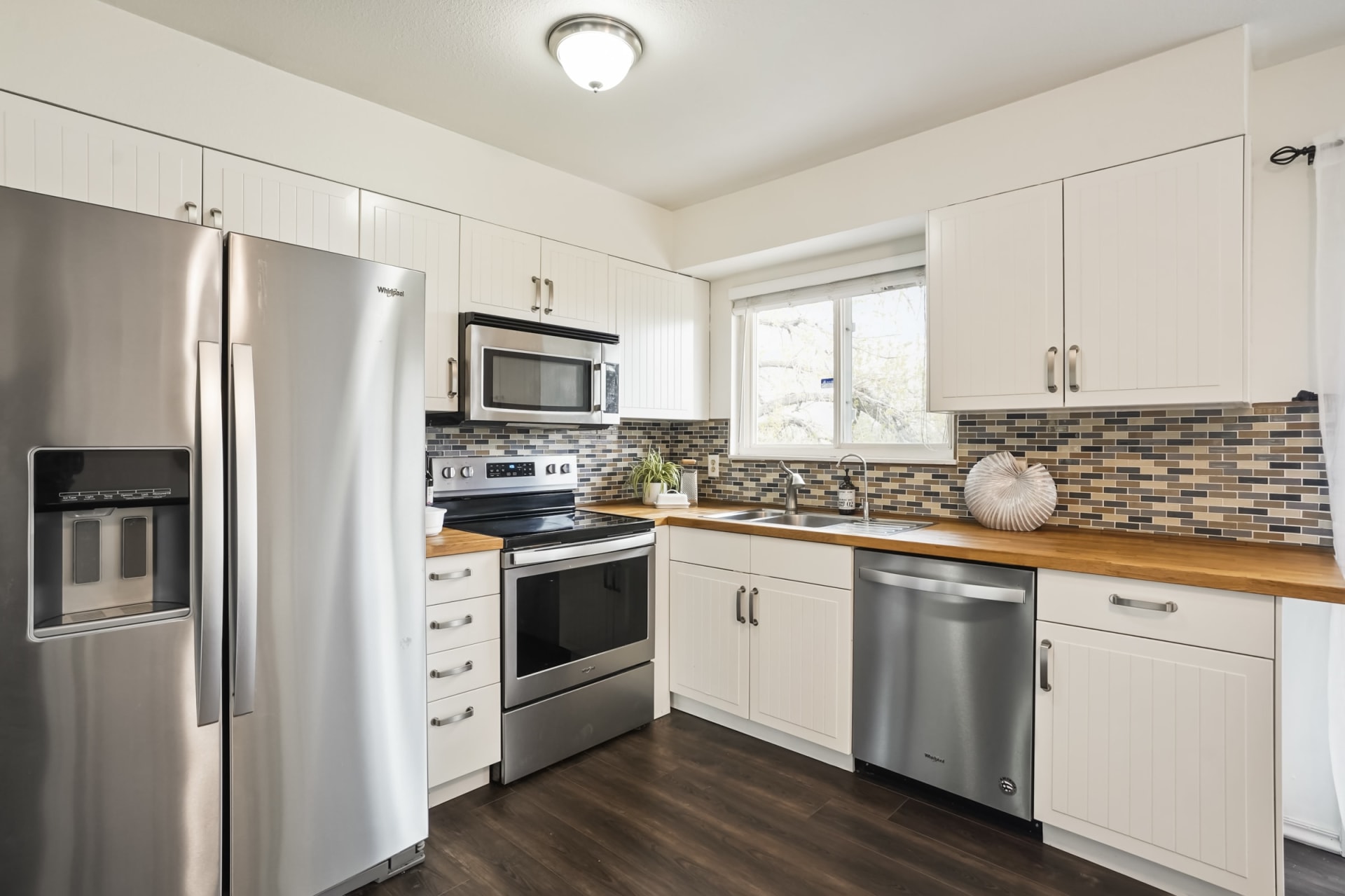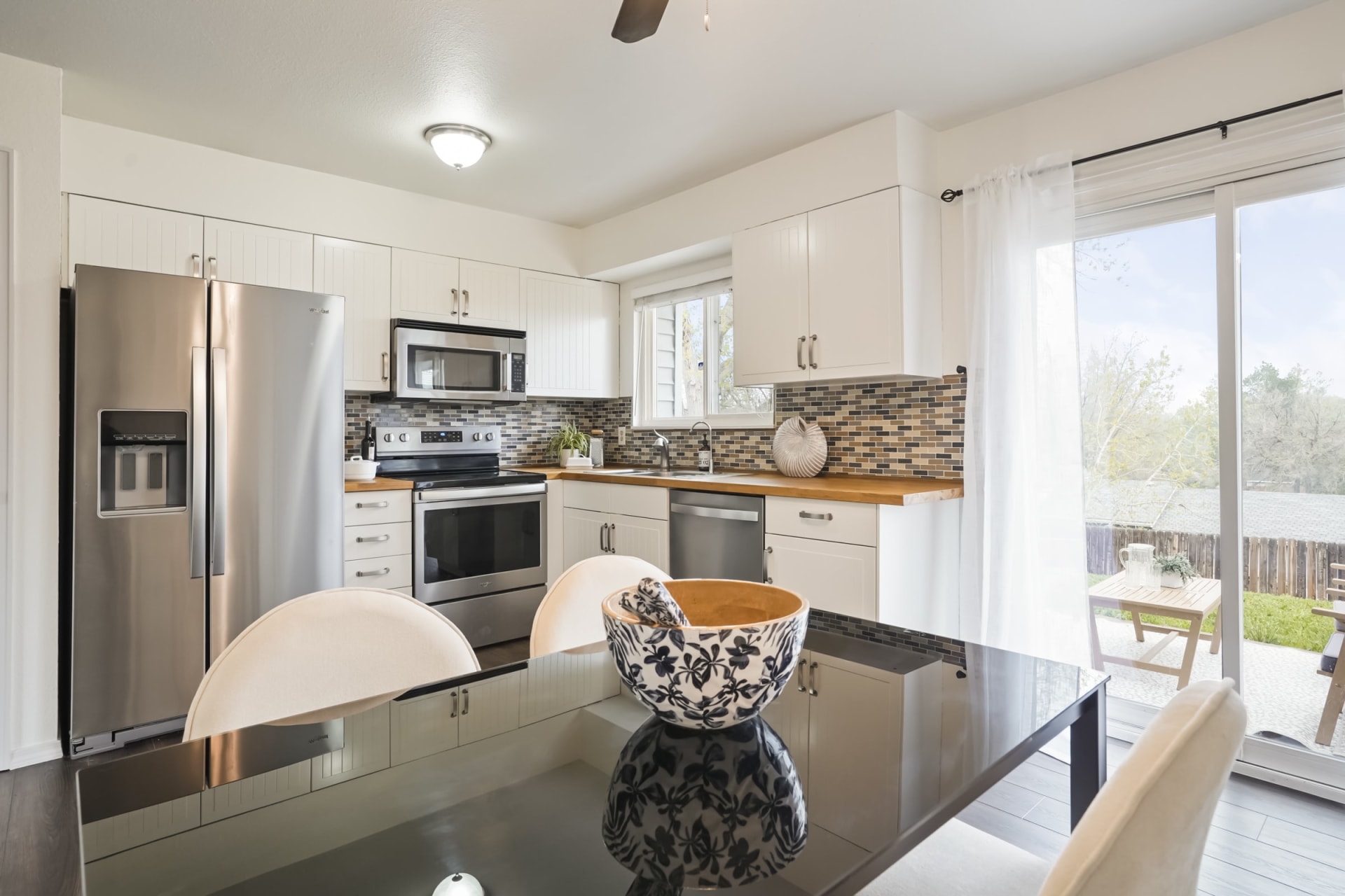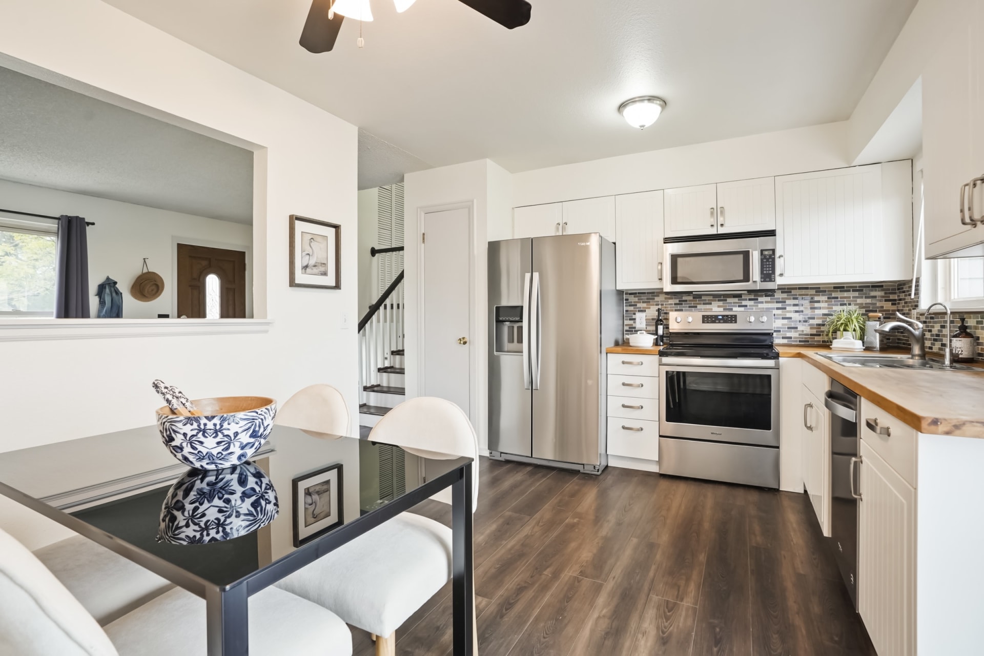 Experience the joy of entertaining in this thoughtfully remodeled kitchen. Adorned with white cabinets, butcher block countertops, a convenient pantry, and sleek stainless steel appliances.