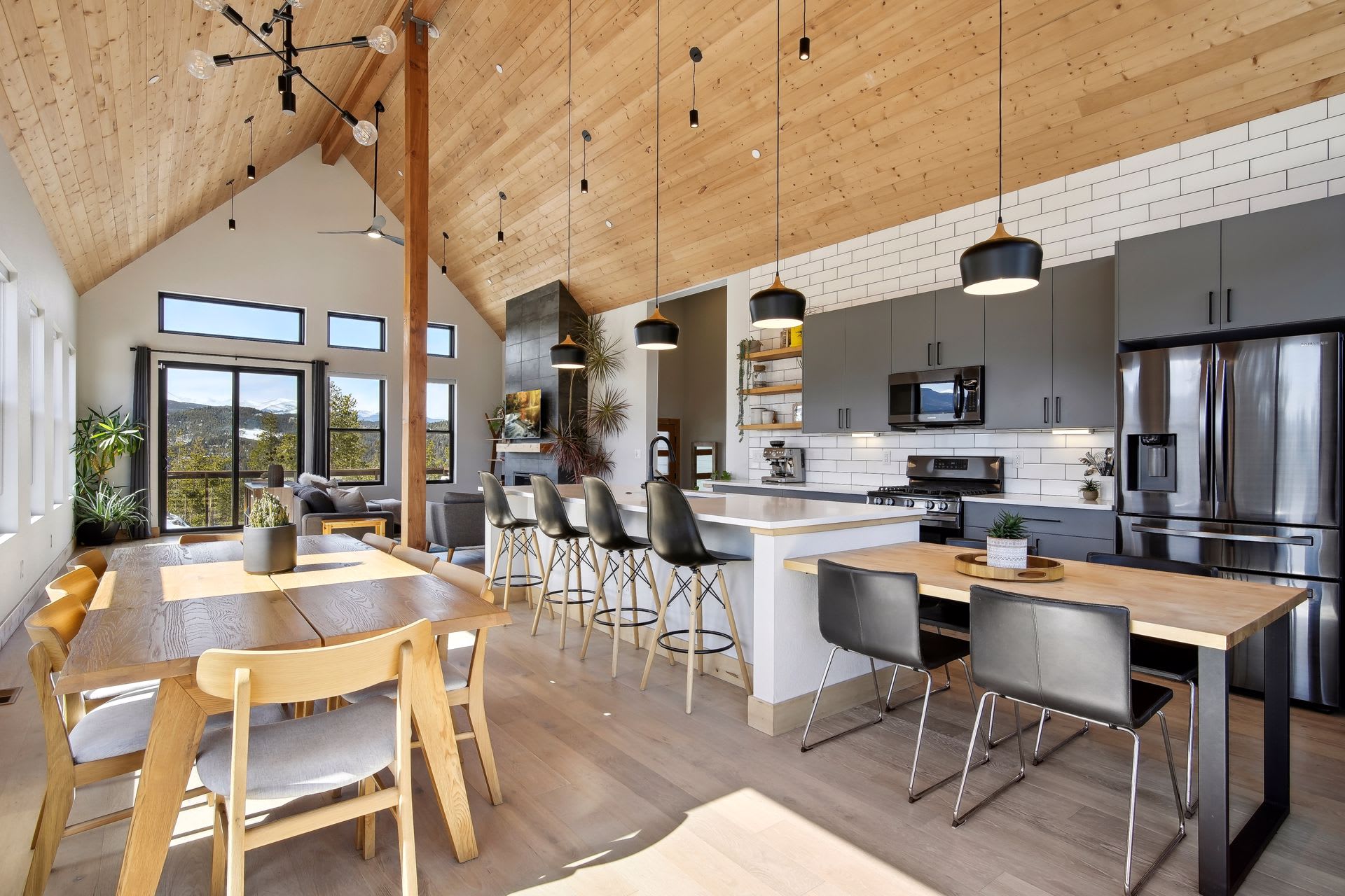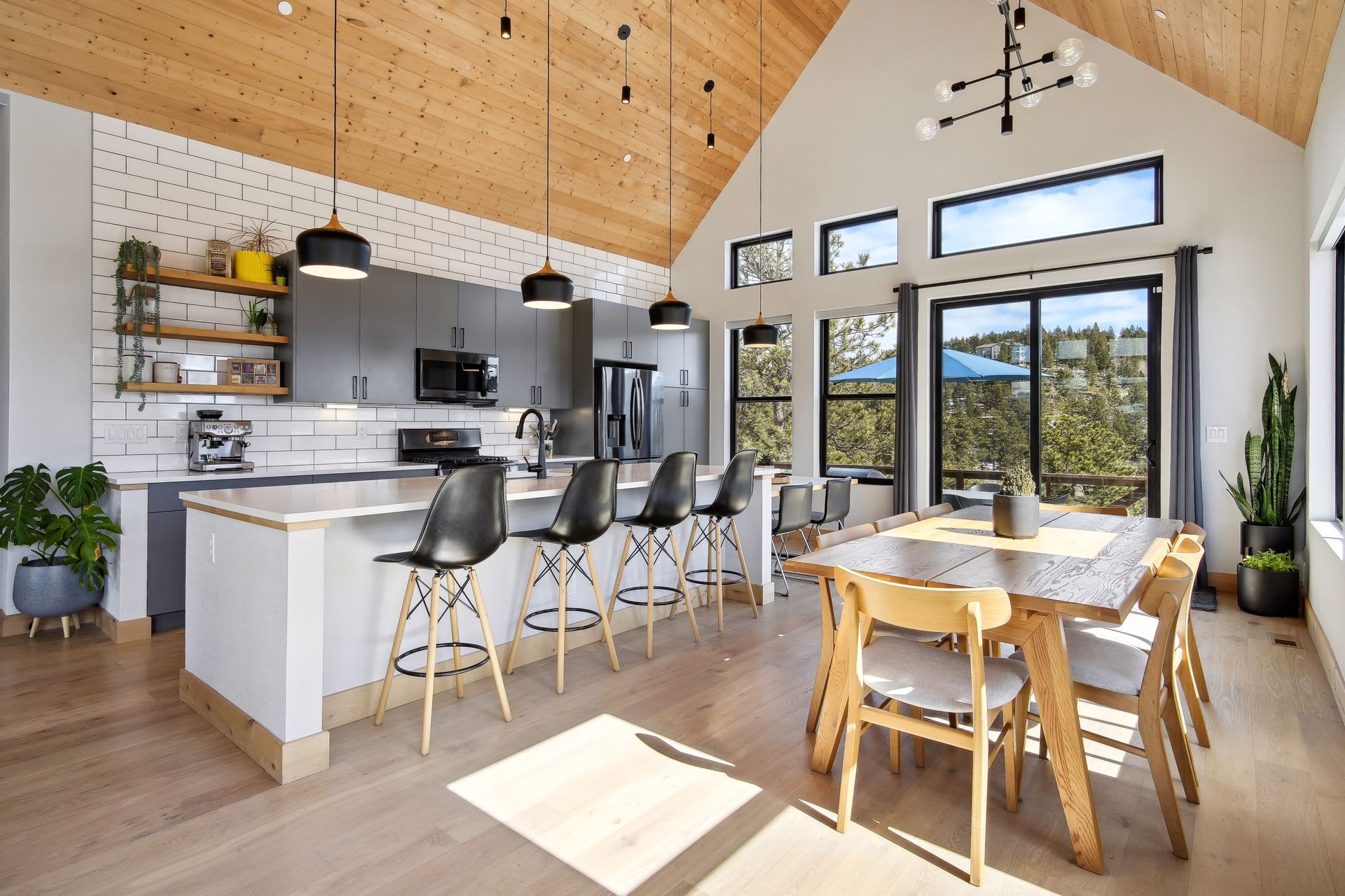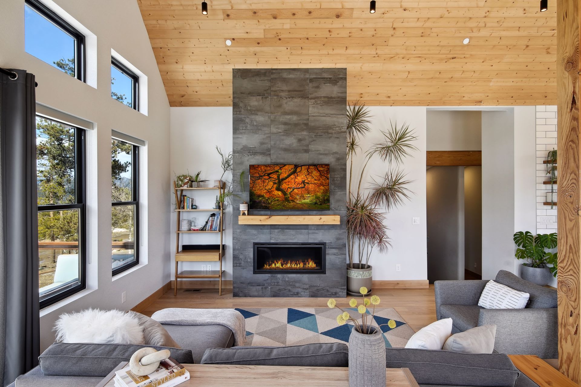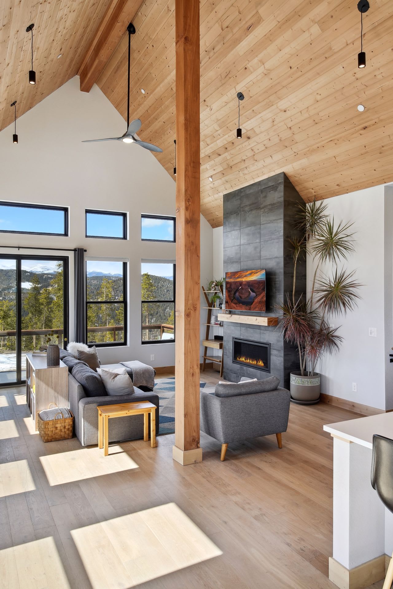 Perched atop Lynx Lair Road this 2020 custom built home was designed to frame the breathtaking mountain views through picture windows to the North, South, and West. The modern Scandinavian vibe is present throughout with clean lines, organic modern style, soaring sealed pine wood ceilings vaulted in the living room, a statement-making fireplace, and beautiful alder doors and trim.