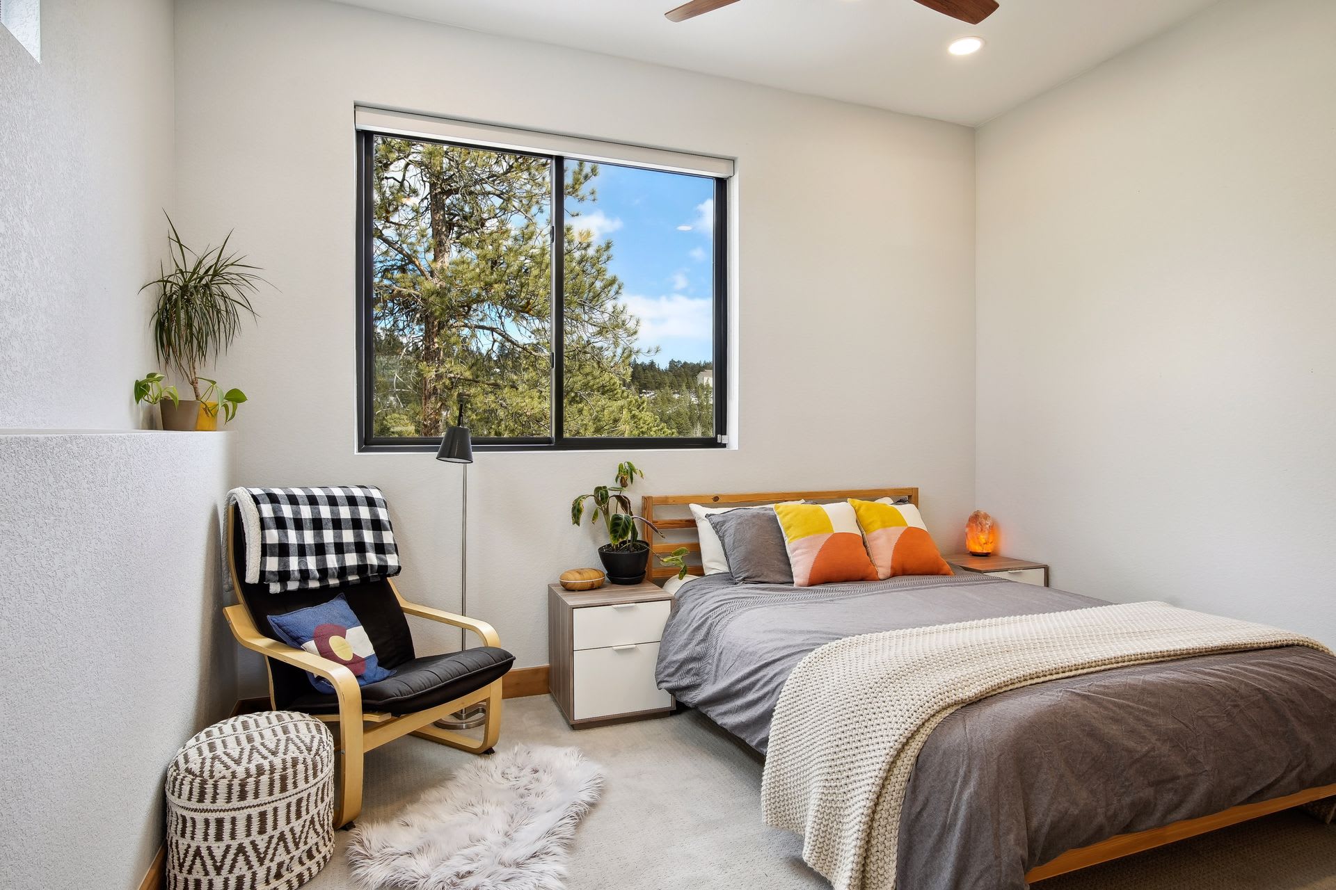 Modern upgrades throughout with sustainability in mind like owned solar panels, Enphase house battery, Starlink internet, tankless hot water heater, smart home lock and thermostat. The home was purposefully designed with passive solar to the South and custom blinds.