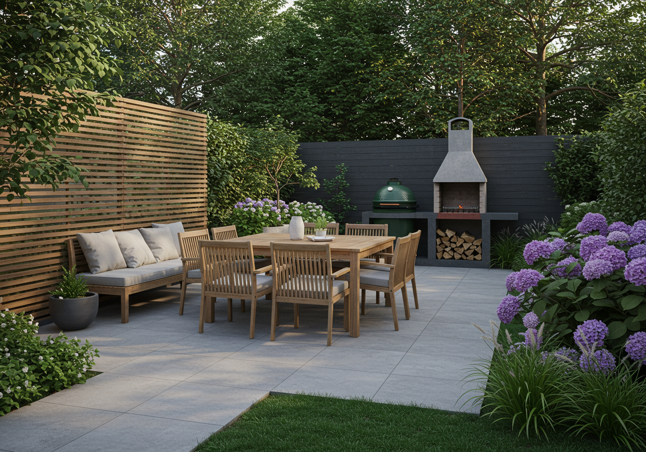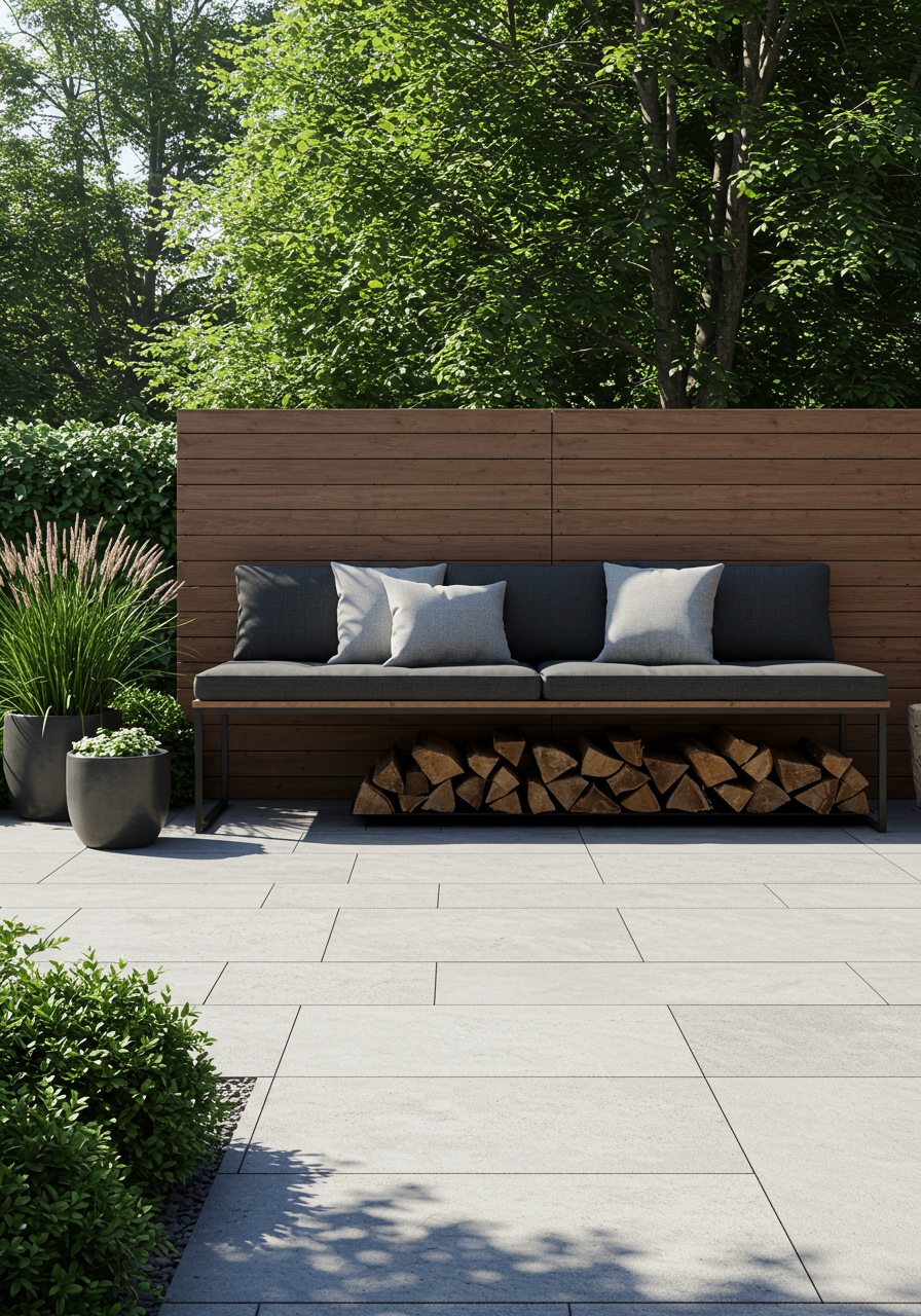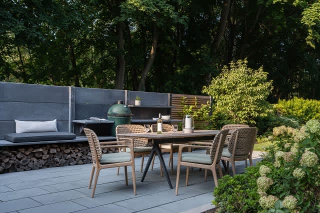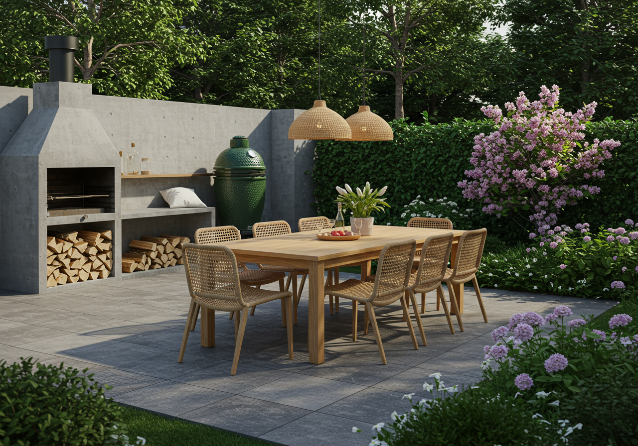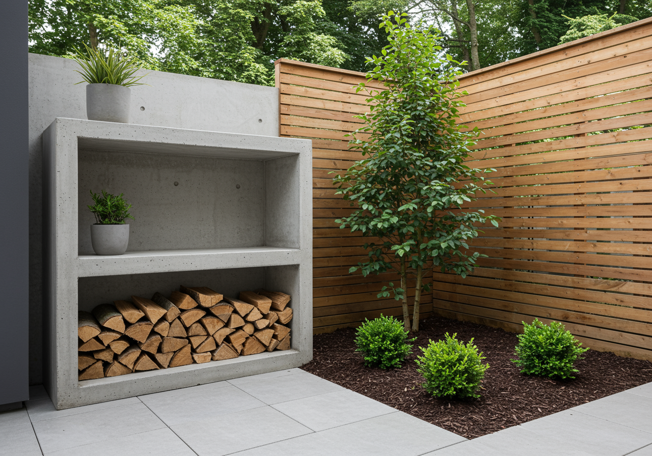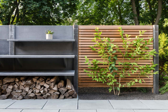 The grill set up at the center of the privacy screen is surrounded by a custom concrete shelving system. The firewood stored along the base of the screen is used to power the egg-shaped wood-burning grill.