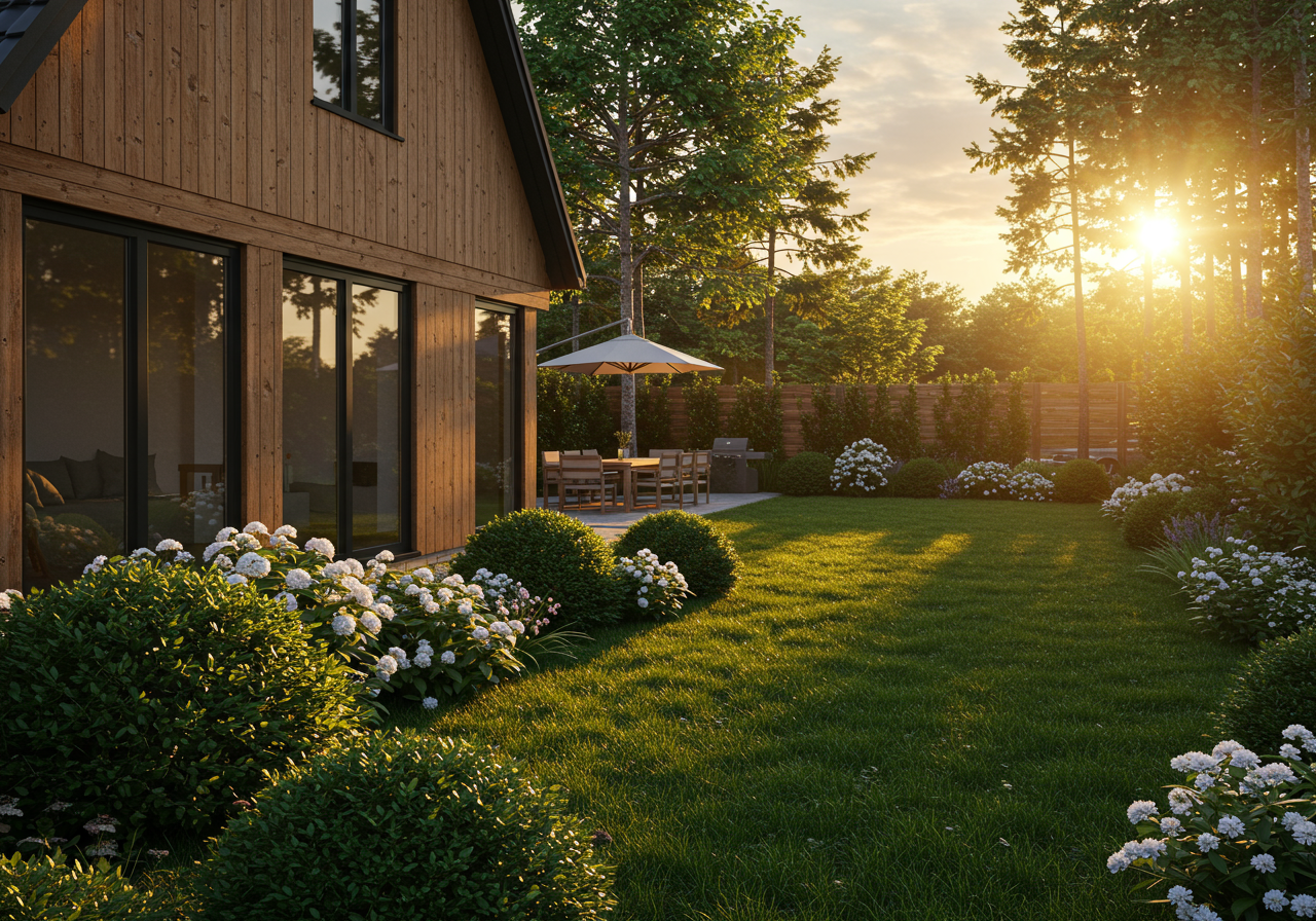 Tucked at the back of the property’s side yard, a large patch of lawn surrounded by lush flower beds leads up to the new patio when entering from the front of the house. “The homeowners have added a lot of modern touches to the house, so creating a transitional-style patio worked well with the overall look,” Daniels says.